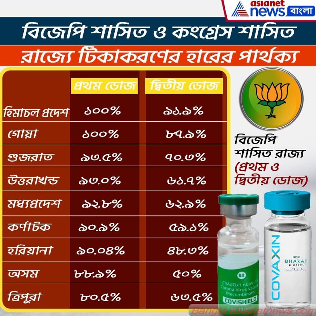 অন্যদিকে, বিজেপি শাসিত রাজ্যগুলির মধ্যে টিকাকরণের হার অনেক বেশি। হিমাচল প্রদেশে প্রথম ডোজ পেয়েছেন ১০০%, দ্বিতীয় ডোজ পেয়েছেন ৯১.৯% মানুষ। গোয়াতে প্রথম ডোজ পেয়েছেন ১০০%, দ্বিতীয় ডোজ পেয়েছেন ৮৭.৯% মানুষ। গুজরাতে প্রথম ডোজ পেয়েছেন ৯৩.৫%, দ্বিতীয় ডোজ পেয়েছেন ৭০.৩% মানুষ। উত্তরাখন্ডে ৯৩.০% মানুষ প্রথম ডোজ ও ৬১.৭% মানুষ দ্বিতীয়ডোজ পেয়েছেন। মধ্যপ্রদেশে প্রথম ডোজ পেয়েছেন ৯২.৮% মানুষ ও ৬২.৯% মানুষ দ্বিতীয় ডোজ পেয়েছেন।