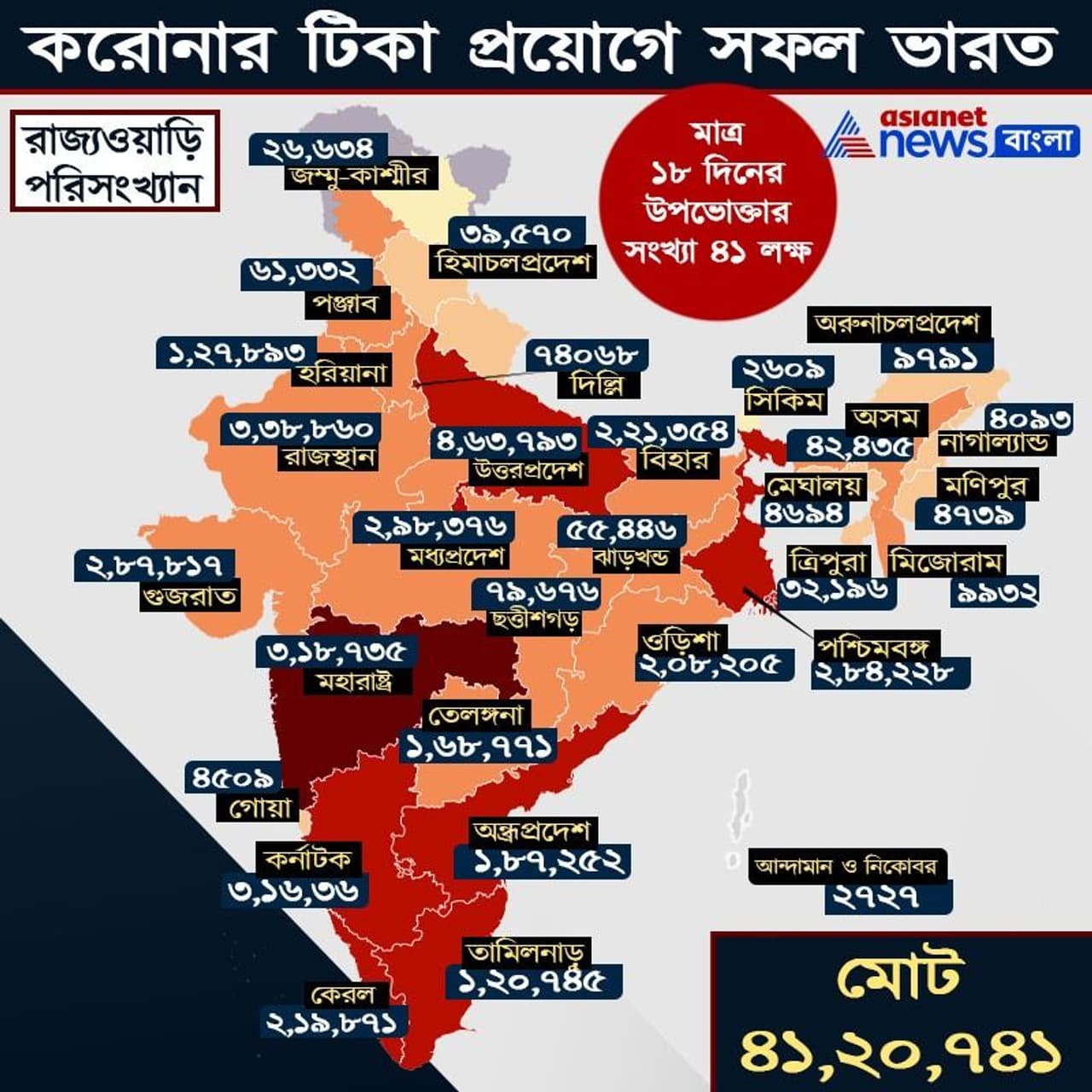 দেশ জুড়ে চলা এই কর্মসূচির প্রথম দিকে রয়েছে পশ্চিমবঙ্গ ও গুজরাত। কোভিড ভ্যাকসিন প্রদানে প্রথমসারির যোদ্ধাদের তালিকা তৈরি করা হয়েছিল। সেক্ষেত্রে তাঁদের তালিকা তৈরি করে ইতিমধ্যেই এই দুই রাজ্য লক্ষ্যমাত্রা পূরণ করে ফেলেছে বলেও স্বাস্থ্যমন্ত্রকের তরফে জানানো হয়েছে। বুধবার সকাল সাতটা পর্যন্ত স্বাস্থ্যমন্ত্রকের রিপোর্ট অনুযায়ী, ৪১ লক্ষ ২০ হাজার ৭৪১ জনের শরীরে করোনার ভ্য়াকসিন প্রদান করা হয়েছে। অন্যদিকে, কর্নাটক ৩ লক্ষ ১৬ হাজার ৩৬৮ জনের টিকাকরণ করেছে। মহারাষ্ট্র ৩ লক্ষ হাজার ৭৩৫ জনকে করোনার টিকা প্রদান করা হয়েছে। একনজরে দেখে নেওয়া যাক রাজ্যওয়াড়ি করোনার টিকাকরণের পরিসংখ্যান।