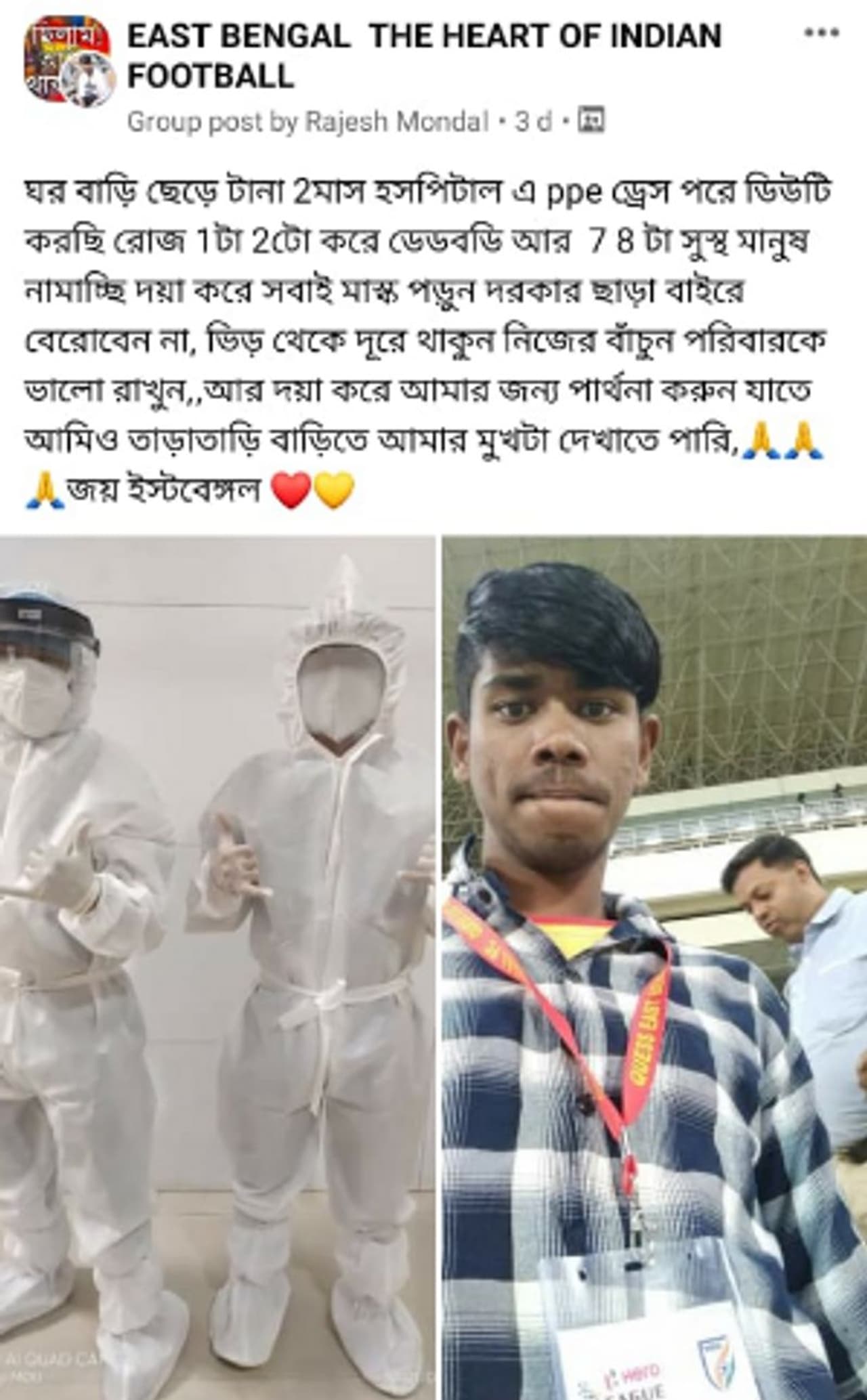 একজন যিনি টানা দু মাস হাসপাতালে ডিউটি করছে PPE ড্রেস পরে। তিনি রাজেশ মণ্ডল। এক সোশ্যাল মিডিয়া পোস্টে তিনি জানিয়েছেন, তাঁকে এই করোনা কালে তাকে ঠিক কতটা পরিশ্রম করতে হচ্ছে। রোজ ১-২টি মৃতদেহ নামানোর কাজ করছেন তিনি। সুস্থ ব্যক্তিদেরও বের করছেন। এই কাজ টানা দু মাস ধরে করে চলেছেন। তিনি যে যোদ্ধা। যুদ্ধ না থামলে যে যোদ্ধাদের ছুটি হয় না। বাড়ির লোকেদের মুখ কত দিন দেখেননি। এই মৃত্যু-যন্ত্রণা-মহামারী দেখে বারবার তিনি আবেদন করছেন, "ভিড় থেকে দূরে থাকুন। নিজের পরিবারের কথা মাথায় রাখুন। প্রয়োজন ছাড়া বাইরে বাইরে বের হবেন না। মাস্ক অবশ্যই পরুন।''
