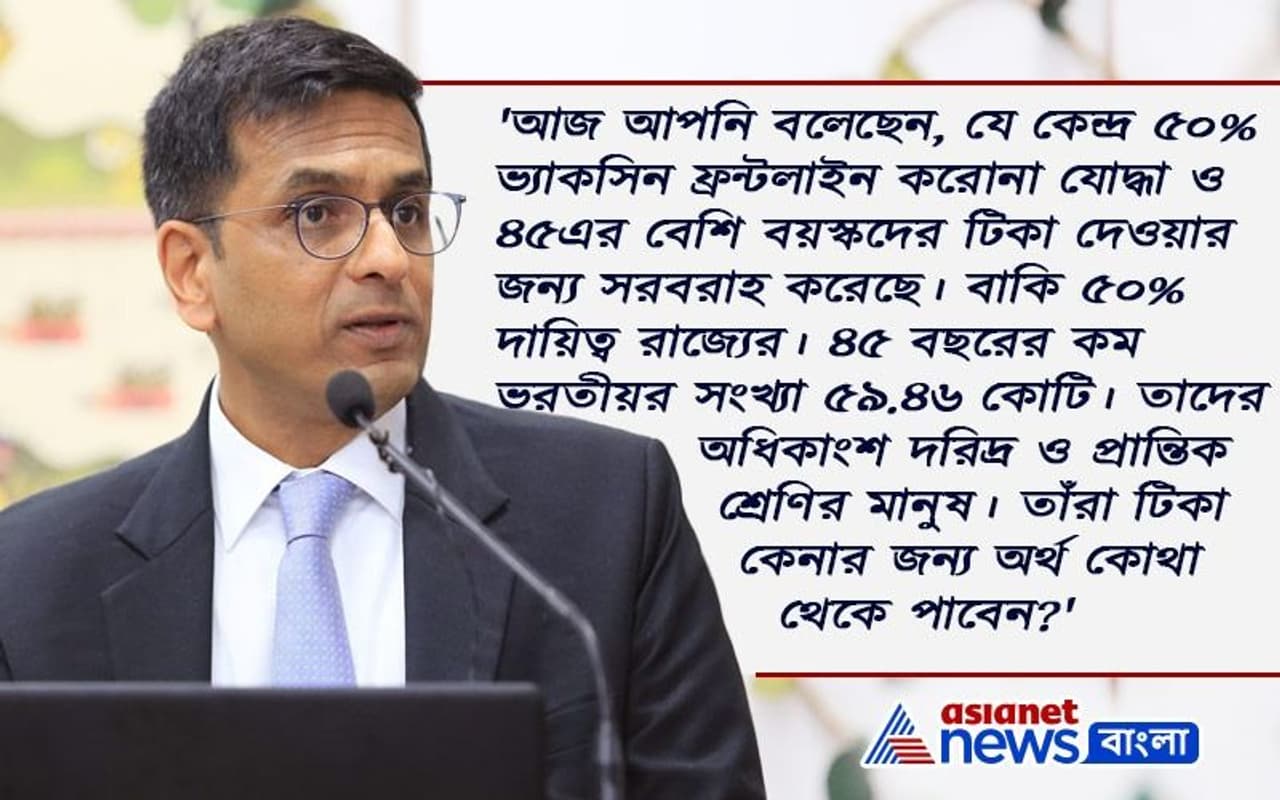 মামলার শুনানি চলাকালীন এদিন সুপ্রিম কোর্ট স্পষ্ট করে জানিয়ে দিয়েছে, কোভিড ভ্যাকসিনের জন্য দেশের আর্থিকভাবে পিছিয়ে পড়া মানুষ অর্থ দিতে পারবে না। আর সেই জন্যই কেন্দ্রীয় সরকারে উচিৎ জাতীয় টিকাদান মডেল গ্রহণ করা। বিচারপতি ডিওয়াই চন্দ্রচূড় বলেন মূল্য নির্ধারণের বিষয়টি অত্যন্ত গুরুত্বপূর্ণ। তিনি আরও বলেন, 'আজ আপনি বলেছেন, যে কেন্দ্র ৫০ শতাংশ ভ্যাকসিন ফ্রন্টলাইন করোনা যোদ্ধা ও ৪৫এর বেশি বয়স্কদের টিকা দেওয়ার জন্য সরবরাহ করেছে। বাকি ৫০ শতাংশের দায়িত্ব রাজ্যের। ৪৫ বছরের কম ভরতীয়র সংখ্যা ৫৯.৪৬ কোটি। তাদের অধিকাংশ দরিদ্র ও প্রান্তিক শ্রেণির মানুষ। তাঁরা টিকা কেনার জন্য অর্থ কোথা থেকে পাবেন?'