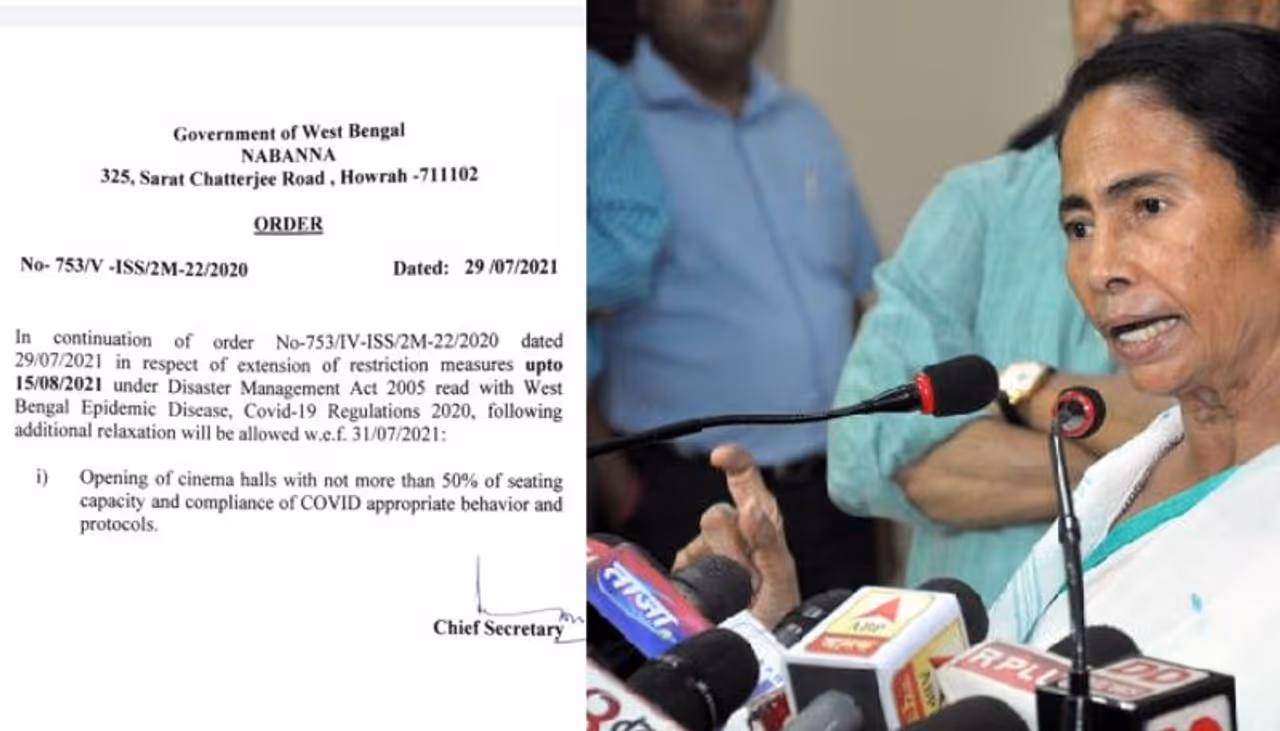 ৫০ শতাংশ দর্শক নিয়ে খোলা যাবে সিনেমা হল। এক প্রেস বিবৃতি প্রকাশ করে জানিয়ে দিল নবান্ন। নবান্নের তরফে জানানো হয়েছে ৩১শে জুলাই থেকে ৫০ শতাংশ দর্শক নিয়ে খোলা যেতে পারে সিনেমা হল। রাজ্য সরকার জানিয়েছে যাবতীয় করোনা বিধি মেনে চলতে হবে সিনেমা হলের ভিতরে।