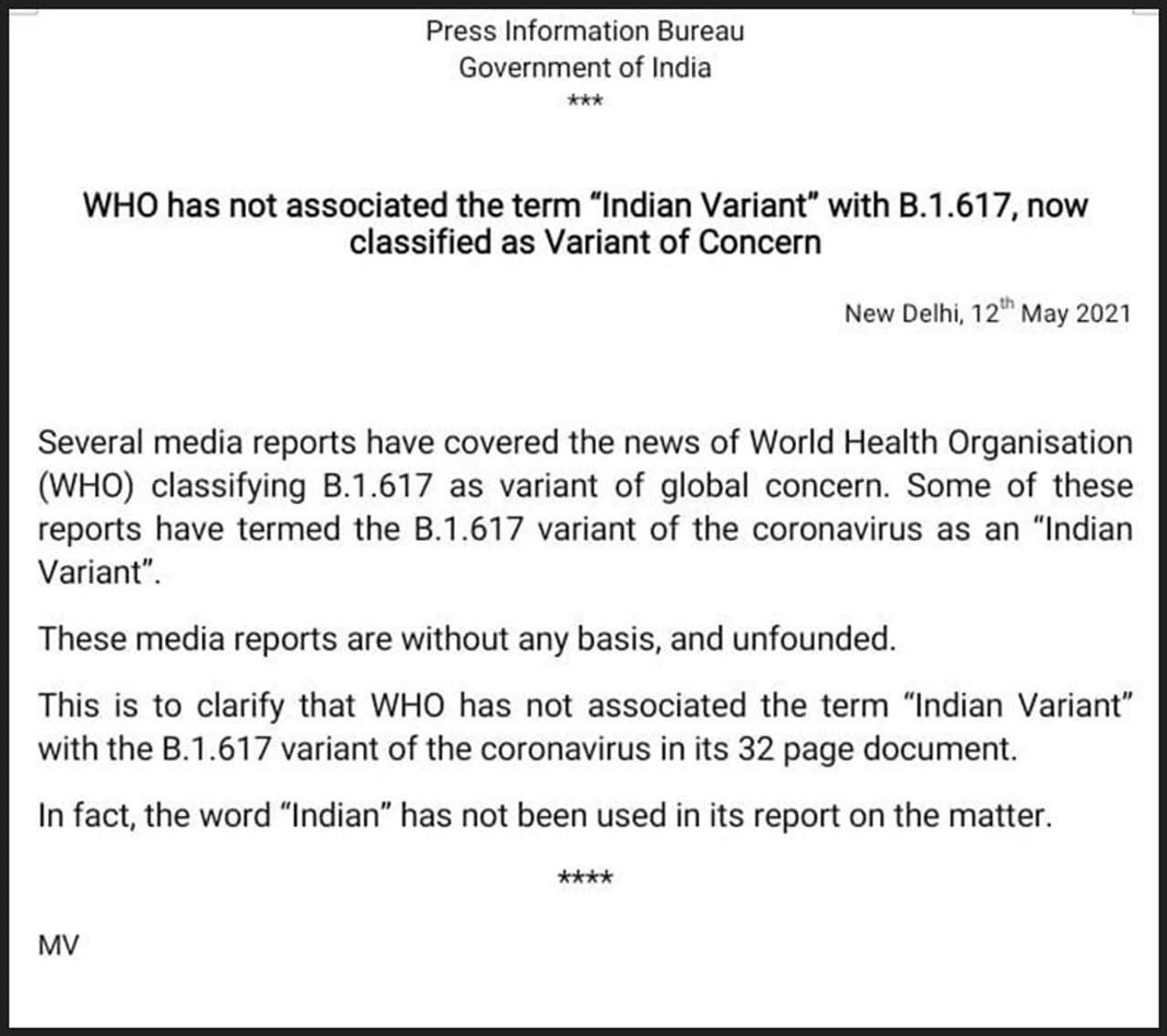 করোনাভাইরাসের B1.617 বা বি ১.৬১৭ রূপটিকে ভারতীয় করোনাভাইরাসের রূপ হিসেবে বিশ্ব স্বাস্থ্য সংস্থা বা WHO দাবি করা হয়েছে বলে যে খবর প্রচারিত হচ্ছ তা নিয়ে সংশয় প্রকাশ করেছে কেন্দ্রীয় সরকার। কেন্দ্রীয় সরকারের পক্ষ থেকে একটি বিবৃতি জারি করে জানান হয়েছে WHO বা বিশ্ব স্বাস্থ্য সংস্থা করোনাভাইরাসের এই রূপটিকে ভারতীয় হিসেবে চিহ্নিত করেনি। তাদের প্রতিবেদনে এই বিষয়টি সম্পর্কে ভারতীয় শব্দটি ব্যবহার করা হয়নি বলেও দাবি করা হয়েছে।