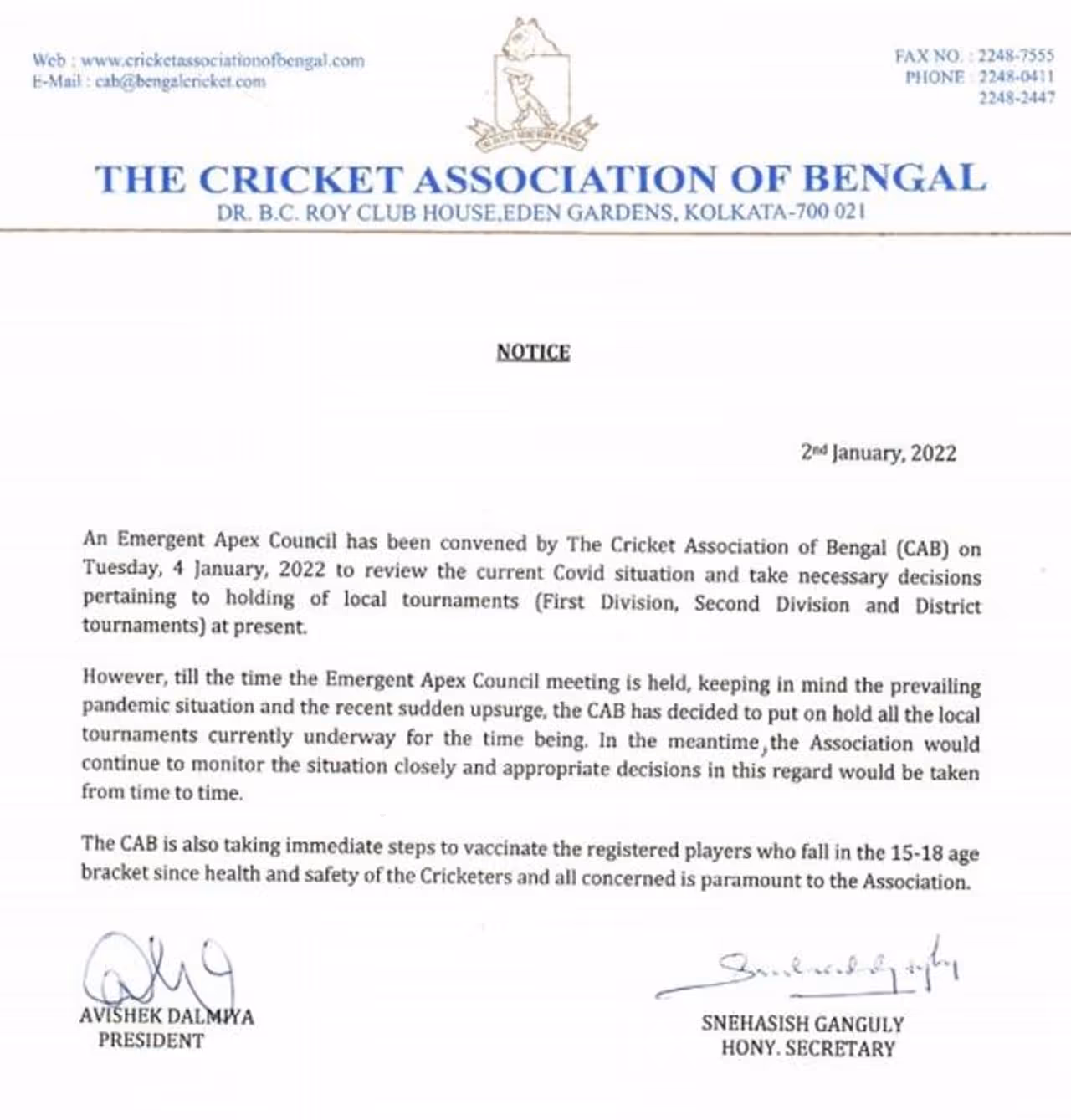 রবিবার সিএবির তরফে একটি নোটিশ জারি করা হয়েছে। সেখানে জানানো হয়েছে, বর্তমান পরিস্থিতি খতিয়ে দেখতে ৪ জানুয়ারি একটি রিভিউ মিটিং করা হবে। সেখানেই প্রথম ডিভিশন, দ্বিতীয় ডিভিশন ও জেলা টুর্নামেন্ট আয়োজনের বিষয়ে সিদ্ধান্ত নেওয়া হতে পারে। তবে যতক্ষণ না বৈঠক হচ্ছে ততক্ষণ সব ধরনের স্থানীয় টুর্নামেন্ট বন্ধ রাখার সিদ্ধান্ত নেওয়া হয়েছে। বর্তমান পরিস্থিতির কথা মাথায় রেখে এই সিদ্ধান্ত নেওয়া হয়েছে। এর মাঝে সিএবি পরিস্থিতির দিকে নজর রাখছে এবং সেই বিষয়ে যথোপযুক্ত ব্যবস্থা নেওয়া হবে।