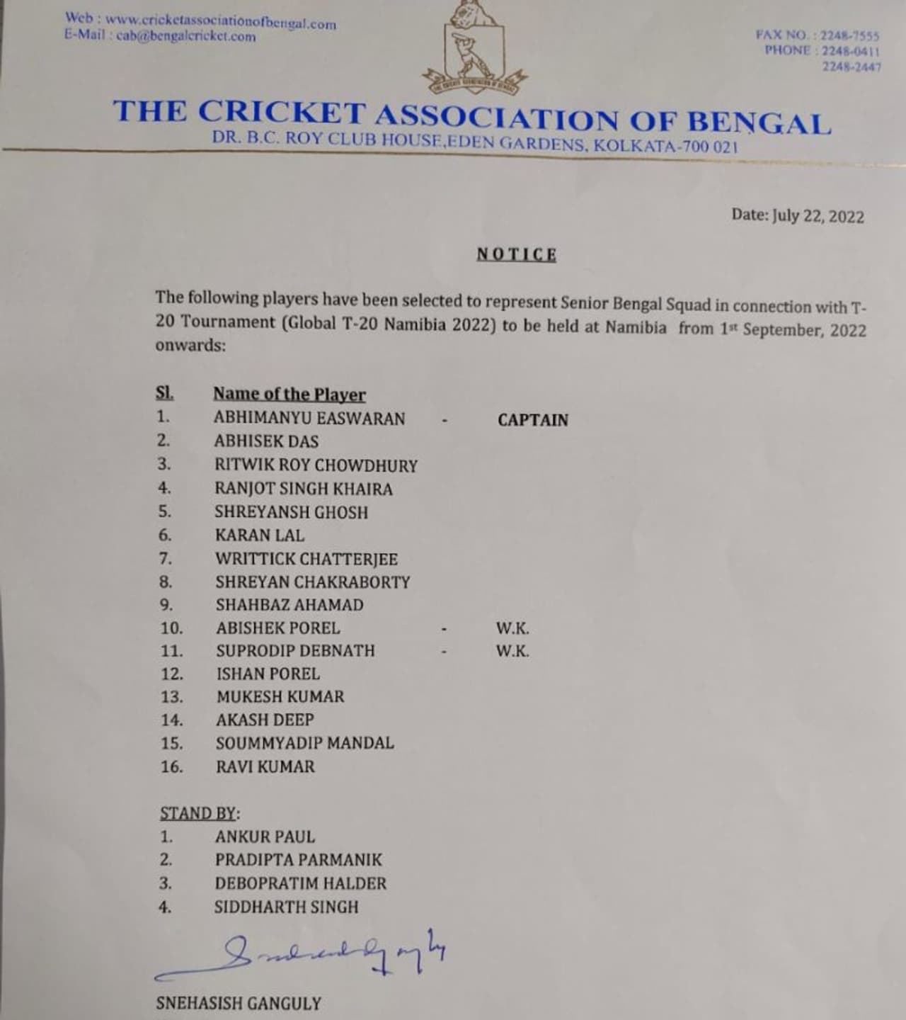 আগামি পয়লা সেপ্টেম্বর থেকে ১০ সেপ্টেম্বর পর্যন্ত নামিবিয়ায় হবে এই টি২০ প্রতিযোগিতা। নামিবিয়া ছাড়াও অংশ নেমে আরও তিনটি দল। সেখানে বাংলা দলকে আমন্ত্রণ জানানো হয়। সেই আবেদনে সাড়া দিয়ে দল পাঠাতে রাজি হয় সিএবি। যে ১৬ জনের দল ঘোষণা করেছে ক্রিকেট অ্যাসোসিয়েশন অফ বেঙ্গল তাতে নাম নেই মনোজ তিওয়ারির। বাংলার মন্ত্রী-ক্রিকেটার এই সফরে যাচ্ছেন না। ১৬ জনের ঘোষিত দলে রয়েছেন, অভিমূন্য ঈশ্বরণ (অধিনায়ক), অভিষেক দাস, ঋত্বিক রায়চৌধুরী, রণজোত সিংহ খাইরা, শ্রেয়াংশ ঘোষ, করণ লাল, ঋত্বিক চট্টোপাধ্যায়, শ্রেয়ান চক্রবর্তী, শাহবাজ আহমেদ, অভিষেক পোড়েল, সুপ্রদীপ দেবনাথ, ঈশান পোড়েল, মুকেশ কুমার, আকাশদীপ, সৌম্যদীপ মন্ডল এবং রবি কুমার। স্ট্যান্ড বাই রাখা হয়েছে অঙ্কুর পাল, প্রদীপ্ত প্রামাণিক, দেবপ্রতিম হালদার এবং সিদ্ধার্থ সিংহকে। কোচ হিসেবে কারও নাম এখনও ঘোষণা না করা হলেও শীঘ্রই তা জানানো হব বলেই সিএবি সূত্রে খবর।