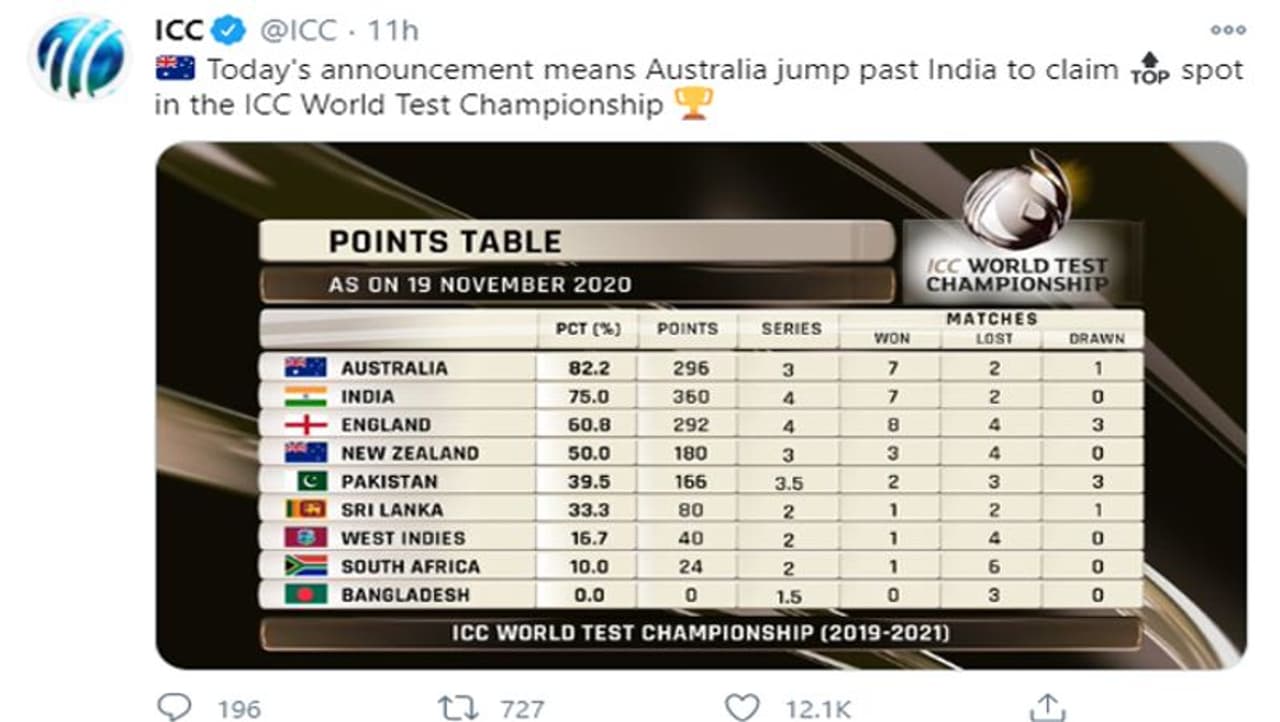করোনা মহামারির জেরে আইসিসির নিয়ম বদল বিশ্ব টেস্ট চ্যাম্পিয়নশিপের পয়েন্টের নিয়মে পরিবর্তন এবার শতকার হারে বিচার করা হবে পয়েন্ট টেবিল  যার ফলে প্রথমস্থান হারাল ভারত, শীর্ষে অস্ট্রেলিয়া