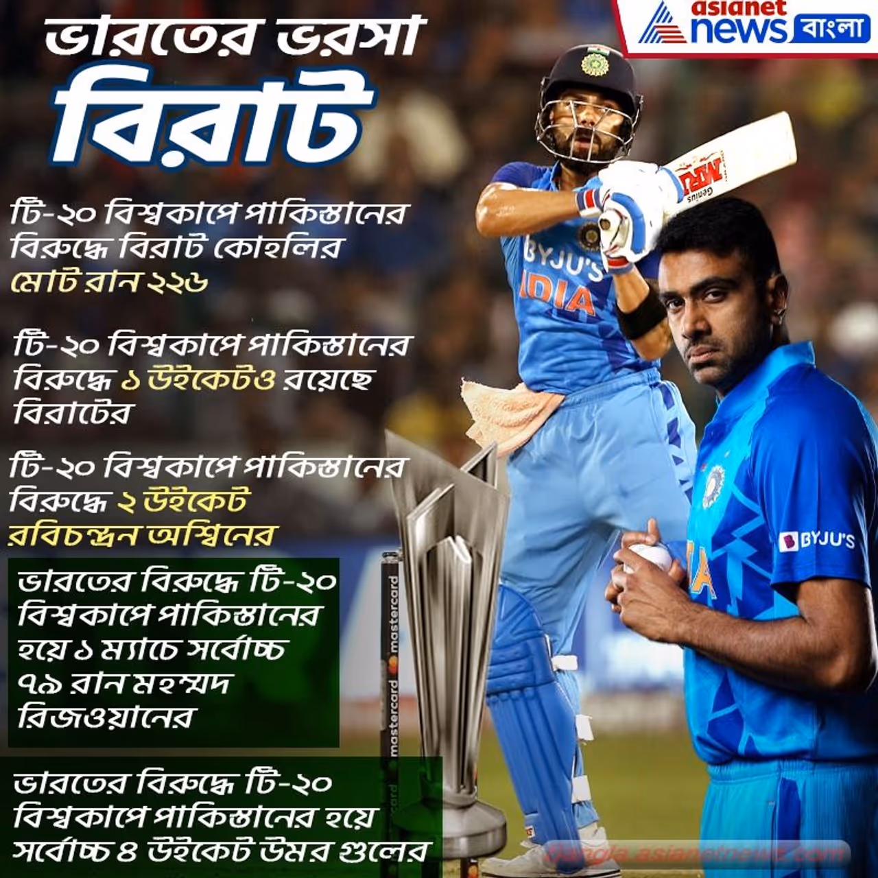 অধিনায়কত্ব ছেড়ে দিলেও, এখনও ভারতীয় ক্রিকেট দলের অন্যতম নির্ভরযোগ্য ব্যাটার। পাকিস্তানের বিরুদ্ধে দু'একটি ম্যাচে তিনি ব্যর্থ হয়েছেন বটে, কিন্তু টি-২০ বিশ্বকাপে বরাবরই তাঁর ব্যাট থেকে বড় রান আসে। এখনও পর্যন্ত টি-২০ বিশ্বকাপে পাকিস্তানের বিরুদ্ধে বিরাটের মোট রান ২২৬। এমনকী, টি-২০ বিশ্বকাপে পাকিস্তানের বিরুদ্ধে ১ উইকেটও রয়েছে বিরাটের। তিনি টি-২০ বিশ্বকাপে পাকিস্তানের বিরুদ্ধে প্রথম ম্যাচ খেলেন ২০১২ সালের ৩০ সেপ্টেম্বর। শ্রীলঙ্কার রাজধানী কলম্বোয় সেই ম্যাচে প্রথমে ব্যাটিং করতে নেমে ১২৮ রানে অলআউট হয়ে যায় পাকিস্তান। অধিনায়ক মহম্মদ হাফিজকে (১৫) বোল্ড করে দেন বিরাট। পাকিস্তানের হয়ে সর্বোচ্চ ২৮ রান করেন শোয়েব মালিক। ভারতের হয়ে ২২ রান দিয়ে ৩ উইকেট নেন লক্ষ্মীপতি বালাজি। ২ উইকেট করে নেন রবিচন্দ্রন অশ্বিন ও যুবরাজ সিং। ৩০ রান দিয়ে ১ উইকেট নেন ইরফান পাঠান। রান তাড়া করতে নেমে দ্বিতীয় বলেই গৌতম গম্ভীরের (০) উইকেট হারায় ভারত। অপর ওপেনার বীরেন্দ্র সেহবাগ করেন ২৯ রান। বিরাট ৬১ বলে ৭৮ রান করে অপরাজিত থাকেন। যুবরাজ ১৯ রানে অপরাজিত থাকেন।