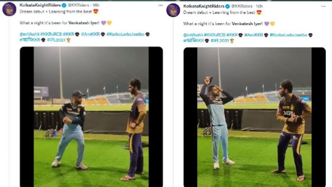 ভিডিওটি শেয়ার করে কেকেআর লিখেছে, 'স্বপ্নের অভিষেক + সেরার থেকে শেখা, ভেঙ্কটেশ আইয়ারের জন্য কি রাতই না গেল!' পরে কোনও কারণে ভিডিওটি সরিয়ে নেওয়া হয়। হয়তো কোহলির গোপন টিপস যাতে ফাঁস না হয়, তার জন্যই।