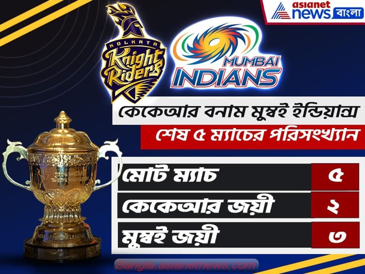 শুধু আইপিএলের ইতিহাসে মোট পরিসংখ্যান নয়, শেষ পাঁচ ম্য়াচের সাক্ষাতেও কিছুটা এগিয়ে এগিয়ে মুম্বই ইন্ডিয়ান্স। আইপিএলে শেষ পাঁচ ম্য়াচে ৩টি ম্য়াচেই জয়ের স্বাদ পেয়েছে পাঁচ বারের চ্যাম্পিয়নরা। অপরদিকে মাত্র ২টি ম্যাচ জিতেছে ২ বারের আইপিএল চ্য়াম্পিয়ন। গত মরসুমে দুই দলের মুখোমুখি সাক্ষাতের পরিসংখ্যান ছিল ১-১। এই মরসুমে এখনও ১-০ ব্যবধানে এগিয়ে রয়েছে কেকেআর।