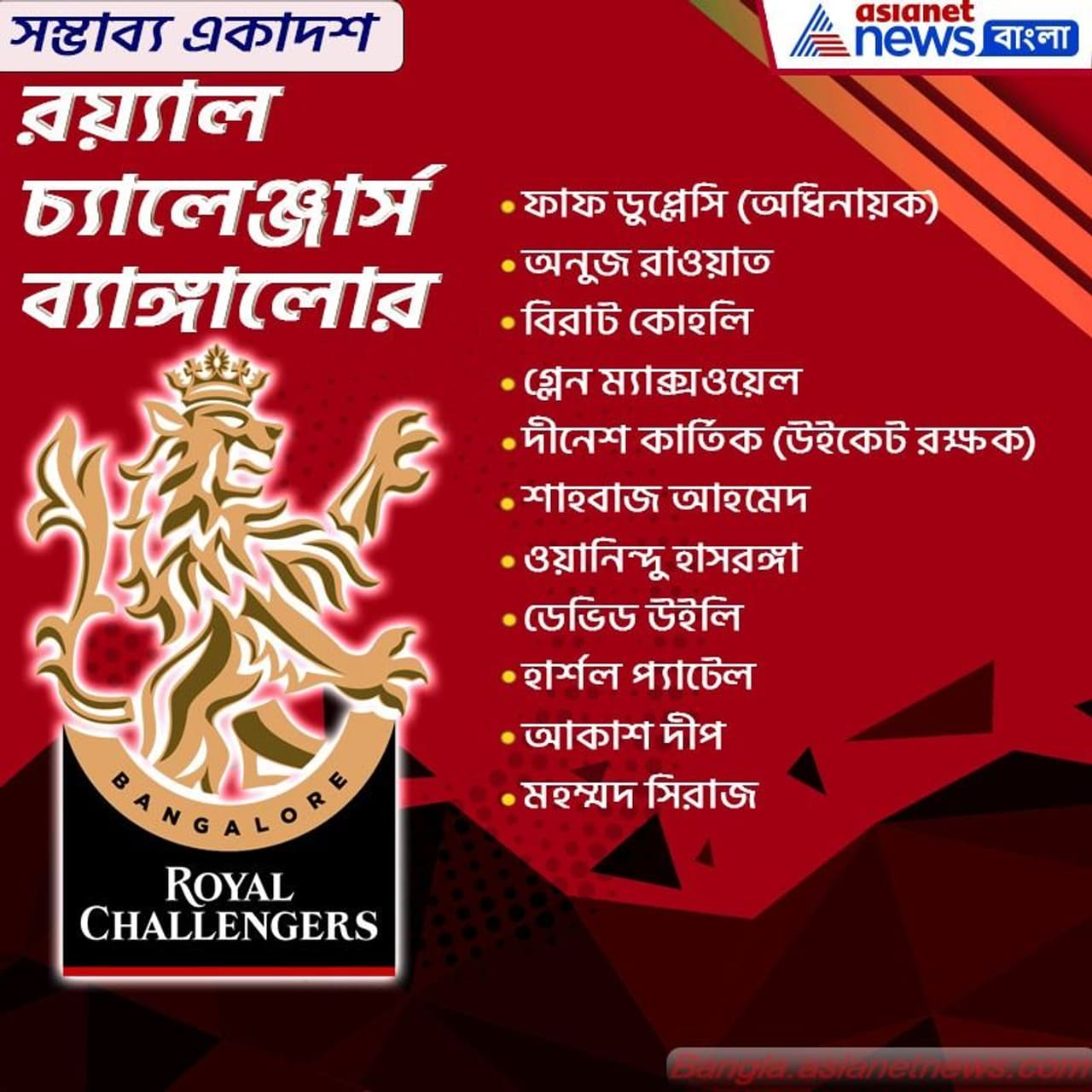 মুম্বই ইন্ডিয়ান্সের বিরুদ্ধে রয়্যাল চ্যালেঞ্জার্স ব্যাঙ্গালোরের প্রথম একাদশের ব্যাটিং লাইনে থাকতে চলেছেন ওপেনিংয়ে অধিনায়ক ফাফ ডুপ্লেসি ও তরুণ অনুজ রাওয়াত। মিডল অর্ডারে খেলবেন প্রাক্তন অধিনায়ক বিরাট কোহলি। এরপর দলের শক্তি বাড়িয়ে আজকের ম্যাচে দলে ফিরছেন গ্লেন ম্যাক্সওয়েল। তাারপর উইকেট রক্ষক ব্যাটসম্য়ান দীনেশ কার্তিক। লোয়ার মিডল অর্ডার ও দলে অলরাউন্ডার হিসেবে খেলবেন শাহবাজ আহমেদ ও ওয়ানিন্দু হাসরঙ্গা। আরসিবির স্পিন বিভাগের দায়িত্বও থাকছে এই দুই ক্রিকেটারের উপর। এছাড়া পেস অ্যাটাকে থাকছেন ডেভিড উইলি, হার্শল প্যাটেল ও মহম্মদ সিরাজ।