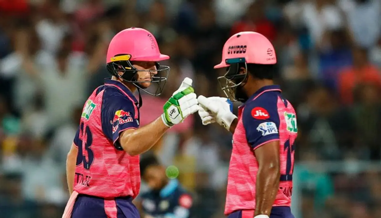 এদিন টস হেরে ব্যাট করতে নেমে ইনিংসের শুরুটা ভালো হয়নি রাজস্থান রয়্যালসের। ১১ রানেই প্রথম উইকেট পড়ে। ৩ রান করে যশ দয়ালের বলে আউট হন যশশ্বী জয়সওয়াল। এরপর ইনিংসের রাশ ধরেন অধিনায়ক সঞ্জু স্যামসন ও জস বাাটলার। ক্রিজে এসে প্রথম থেকেই বিধ্বংসী ব্য়াটিং শুরু করেন সঞ্জু। অপরদিকে এদিন সাবধানী ব্যটিং করতে দেখা যায় বাটলারকে। নিজেদের অর্ধশতরানের পার্টনারশিপও পূরণ করেন সঞ্জু ও বাটলার জুটি। ২৬ বলে ৪৭ রান করে দলের ৭৯ রানের মাথায় সাই কিশোরের বলে আউট হন সঞ্জু। এরপর দলের ইনিংস এগিয়ে নিয়ে যান জস বাটলার ও দেবদূত পাড়িকল। দুজন মিলে জুটিতে ৩৭ রান যোগ করেন। দলের ১১৬ রানের মাথায় ব্যক্তিগত ২৮ রান করে হার্দিক পান্ডিয়ার বলে বোল্ড হন পাড়িকল। অপরদিকে নিজেরে অর্ধশতরান পূরণ করে ফেলেন জস বাটলার। তারপর বিধ্বংসী রূপ ধারন করেন বাটলার। হেটমায়াররের সঙ্গে ৪৫ রানের পার্টনারশিপ করেন। দলের ১৬১ রানে ব্যক্তিগত ৪ রান করে মহম্মদ শামির বলে আউট হন হেটমায়ার। শেষ ওভারে গিয়ে ৮৯ রান করে রান আউট হন তিনি। এছাডডা ৪ রান করে রান আউট হন রিয়ান পরাগও। শেষ পর্যন্ত ২০ ওভারে ১৮৮ রানে থামে রাজস্থান রয়্যালসের ইনিংস।