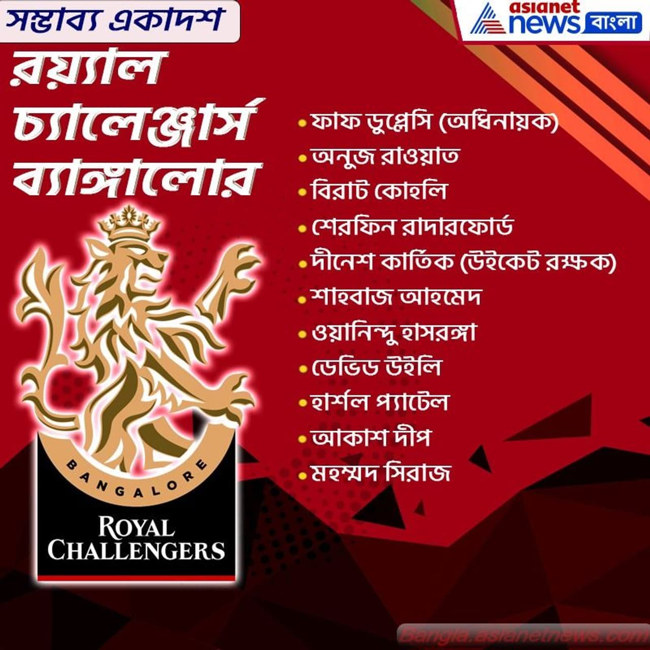 অপরদিকে, কেকেআরের বিরুদ্ধে প্রথম ম্য়াচে আরসিবির প্রথম একাদশের ব্যাটিং লাইনে থাকতে চলেছেন ওপেনিংয়ে অধিনায়ক ফাফ ডুপ্লেসি ও তরুণ অনুজ রাওয়াত। মিডল অর্ডারে খেলবেন প্রাক্তন অধিনায়ক বিরাট কোহলি, শেরফিন রাদারফোর্ড ও উইকেট রক্ষক ব্যাটসম্য়ান দীনেশ কার্তিক। লোয়ার মিডল অর্ডার ও দলে অলরাউন্ডার হিসেবে খেলবেন শাহবাজ আহমেদ ও ওয়ানিন্দু হাসরঙ্গা। আরসিবির স্পিন বিভাগের দায়িত্বও থাকছে এই দুই ক্রিকেটারের উপর। এছাড়া পেস অ্যাটাকে থাকছেন ডেভিড উইলি, হার্শল প্যাটেল ও মহম্মদ সিরাজ। পঞ্জাবের বিরুদ্ধে একেবারেই ছন্দে পাওয়া যায়নি আরসিবির বোলিং লাইনকে, দ্বিতীয় ম্যাচে ছন্দে ফিরকে মরিয়া সকলেই।