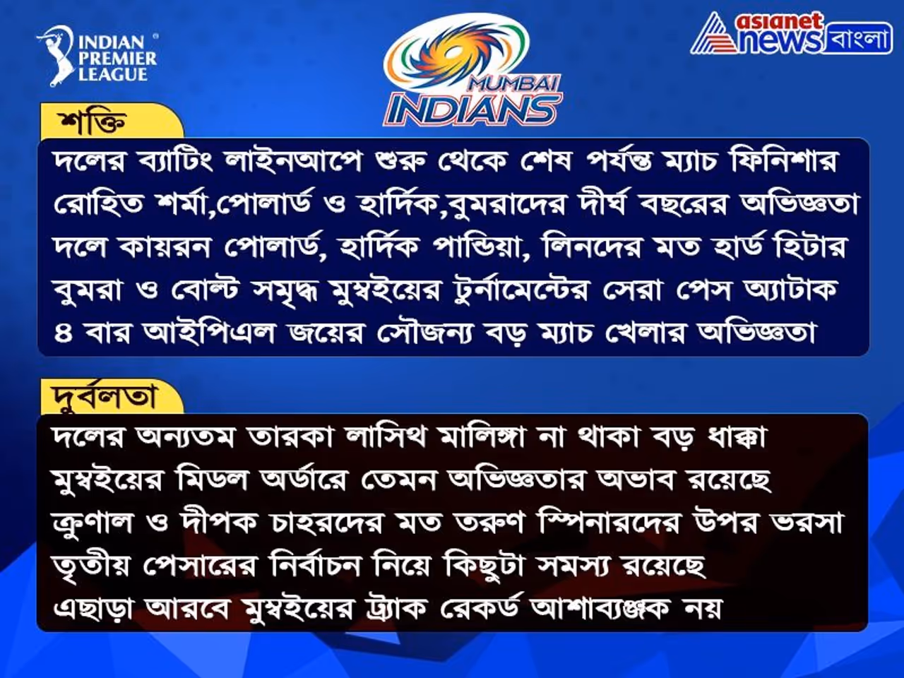 প্রথম ম্যাচের আগে কোন দল এগিয়ে বা কোন দল একটু পিছিয়ে তা নিয়ে চুল চেরা বিশ্লেষণ শুরু হয়ে গিয়েছে। দুই দলেই কিছু সমস্যা রয়েছে। কিন্তু কিন্তু খেলার শুরুর আগে দলগত শক্তির বিচারে মুম্বইকেই কিছুটা এগিয়ে রাখছেন ক্রিকেট বিশেষজ্ঞরা। মুম্বই টিমের প্রত্যেকটি বিভাগে ভারসাম্যই তাদের দলের অন্যতম শক্তি। ব্যাটিং রয়েছে রোহিত শর্মা ও কুইন্টন ডি ককের মত অভিজ্ঞতা ও বিধ্বংসী ইনিংস খেলার ক্ষমতা। তেমনই মিডল অর্ডারে সুর্য কুমার যাদব, ইষাণ কিষান ও ক্রিস লিনদের উপরই ভরসা রাখছে দল। শেষে স্লগ ওভারে রানের ঝ়ড় তোলার জন্য রয়েছে কায়রন পোলার্ড ও হার্দিক পান্ডিয়াদের মত হার্ড হিটার। মুম্বইয়ের বোলিং বিভাগে এবার বুমরা ও ট্রেন্ট বোল্ট জুটি দেখার জন্য মুখিয়ে রয়েছেন সকলেই। যে কোনও দিন বিপক্ষের ব্যাটিং লাইন আপকে ধসিয়ে দেওয়ার ক্ষমতা রাখেন তারা। এছাড়াও স্পিন বিভাগে রয়েছেন ক্রুণাল পান্ডিয়া ও রাহুল চাহারদের মত তরুণ তুর্কিরা। যদিও লাসিথ মালিঙ্গার অভাব যে পূরণ করা সম্ভব নয়, সেই কথা নিজেই জানিয়েছেন রোহিত শর্মা। ফলে প্রথম ম্যাচ শুরুর আগে দেখে নেওয়া যাক মুম্বই ইন্ডিয়ান্সের শক্তি ও দুর্বলতা।