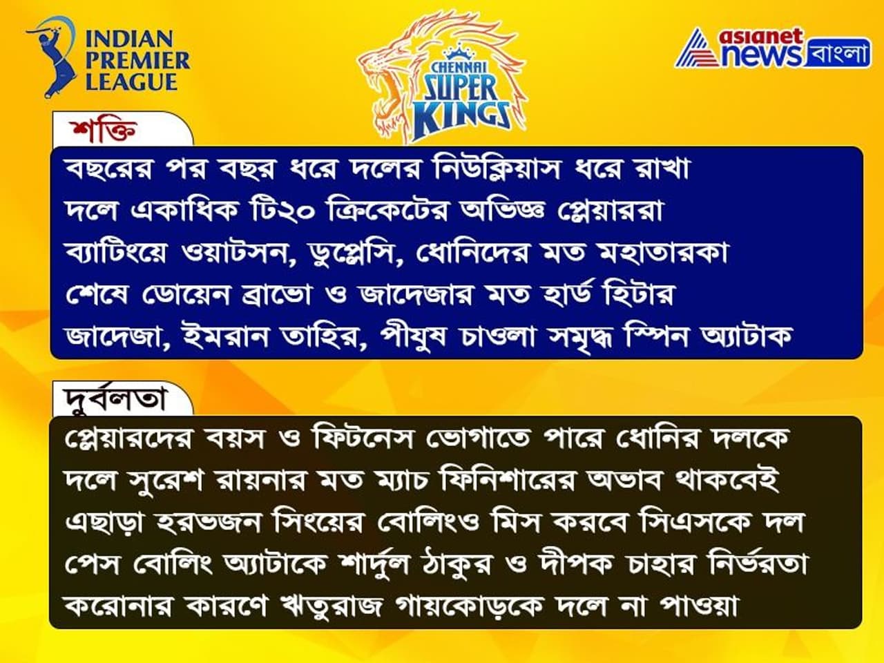 অপরদিকে টুর্নামেন্টের শুরু থেকেই বাধা বিপত্তিতে জর্জরিত চেন্নাই সুপার কিংস দল। ২৮ অগাস্ট অনুশীলন শুরুর আগেই ধোনির দলে থাবা বসায় করোনা ভাইরাস। দুই প্লেয়ার ঋতুরাজ গায়কোয়াড় ও দীপক চাহর সহ ১৩ জন সদস্য করোনা আক্রান্ত হন। দীপক চাহার করোনা মুক্ত হলেও, এখনও করোনা পজেটিভ ঋতুরাজ। এছাড়া সুরেশ রায়না ও হরভজন সিংয়ের মত তারকার আইপিএল না খেলার সিদ্ধান্ত নেওয়া বড় ধাক্কা চেন্নাই সুপার কিমস দলের কাছে। তবুও দলের অধিনায়কের নাম যেহেতু মহেন্দ্র সিং ধোনি, তাই কোনও মতেই বিপক্ষকে অক ইঞ্চ জমি ছাড়তে নারাজ তিনি। সীমিত শক্তি নিয়েই মুম্বই বধের ঘুঁটি সাজাচ্ছে তিনবারের আইপিএল চ্যাম্পিয়নরা। জোর কদমে অনুশীলনও করেছেন শেন ওয়াটসন, ফাফ ডুপ্লেসি, ধোনি, জাদেজা সহ গোটা টিম। ধোনির কাছে তাদের ম্যাচ পিছিয়ে দেওয়ার অপশন থাকলেও, ধোনি প্রথম ম্যাচই খেলতে চেয়ে বুঝিয়ে দিয়েছেন পরিস্থিতি যাই হোক গতবারের ফাইনাল হারের বদলা নিতে মুখিয়ে রয়েছেন তিনি। এবার দেখে নেওয়া যাক চেন্নাই সুপার কিংস দলের শক্তি ও দুর্বলতা।
