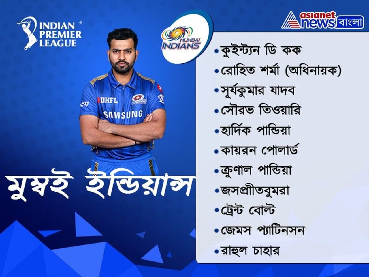 দুই দলই প্রথম একাদশে বেশ কিছু চমক রেখেছে। মু্ম্বই দলে রয়েছেন কুইন্ট্যন ডি কক,রোহিত শর্মা,সূর্যকুমার যাদব, সৌরভ তিওয়ারি,হার্দিক পান্ডিয়া,কায়রন পোলার্ড, ক্রুণাল পান্ডিয়া, জসপ্রাীতবুমরা, ট্রেন্ট বোল্ট, জেমস প্যাটিনসন, রাহুল চাহার।