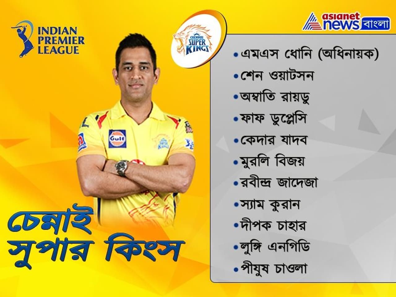 চেন্নাই সুপার কিংস দলে রয়েছে , এমএস ধোনি, শেন ওয়াটসন , অম্বাতি রায়ডু, ফাফ ডুপ্লেসি, কেদার যাদব ,মুরলি বিজয়, রবীন্দ্র জাদেজা, স্যাম কুরান, দীপক চাহার, লুঙ্গি এনগিডি, পীযুষ চাওলা।