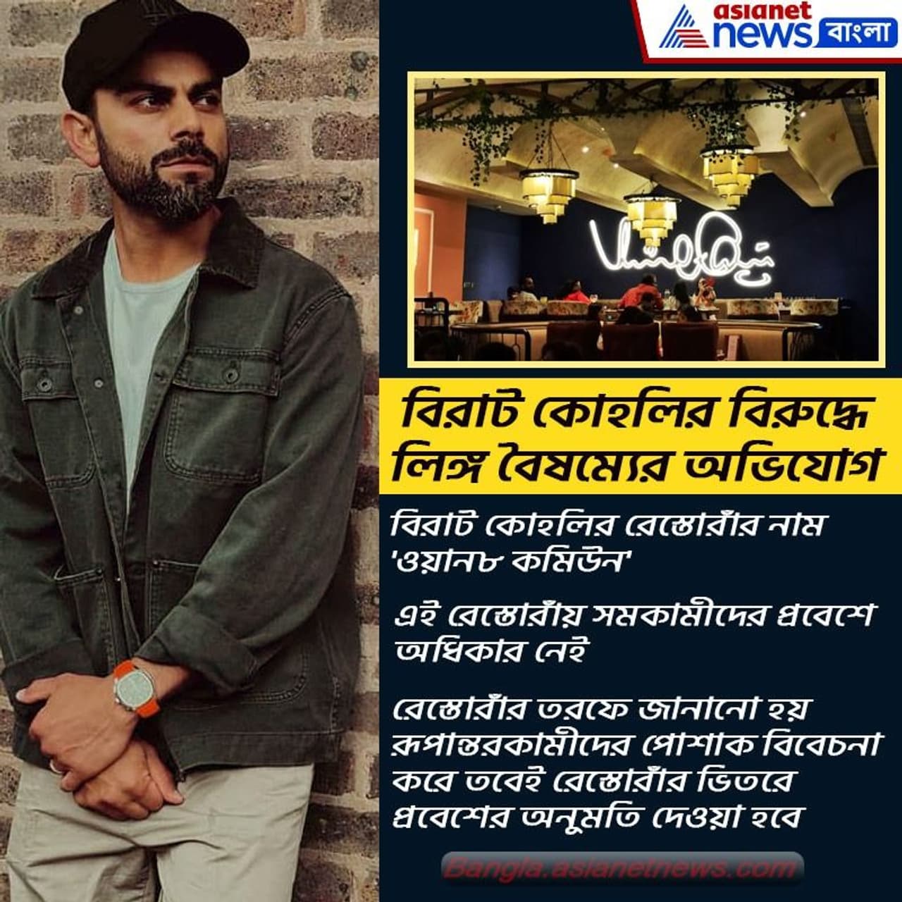 ‘ওয়ান ৮ কমিউন’ (One 8 Commune) নামে বিরাট কোহলির একটি রেস্তোরাঁ চেন রয়েছে। দেশের বিভিন্ন শহরে রয়েছে এই রেস্তোরাঁগুলি। কবে সবকিট রেস্তোরঁর বিরুদ্ধে এই অভিযোগ ওঠেনি। অভিযোগ কেবল পুণে ব্রাঞ্চের বিরুদ্ধে। সেখানে নির্দেশিকা টানিয়ে বলা হয়েছে সমকামীদের প্রবেশাধিকার নেই। এমন নির্দেশিকার নিন্দা করে 'ইয়েস উই এক্সজিস্ট ইন্ডিয়া'-র তরফে সোশ্যাল মিডিয়ায় লেখা হয়েছে, কোহলীর রেস্তরাঁয় শুধুমাত্র বিসমকামী যুগল ও মেয়েদের ঢুকতে দেওয়া হয়। সমকামীদের প্রবেশে অনুমতি নেই। এই বিষয়ে পুমে ব্রাঞ্চের দফতরে লিখিত অভিযোগ জানানো হয়েছিল। কিন্তু কোনও জবাব মেলেনি। তারপর ফোন করা হলেবিষয়টির সত্যতা তারা শিকার করে নেওয়া হয়। একই সঙ্গে বিরাট কোহলির রেস্তোরাঁর বিরুদ্ধে অভিযোগ, পোশাক-পরিচ্ছদ দেখেই ঢুকতে দেওয়া হয় রূপান্তরকামী মহিলাদের।