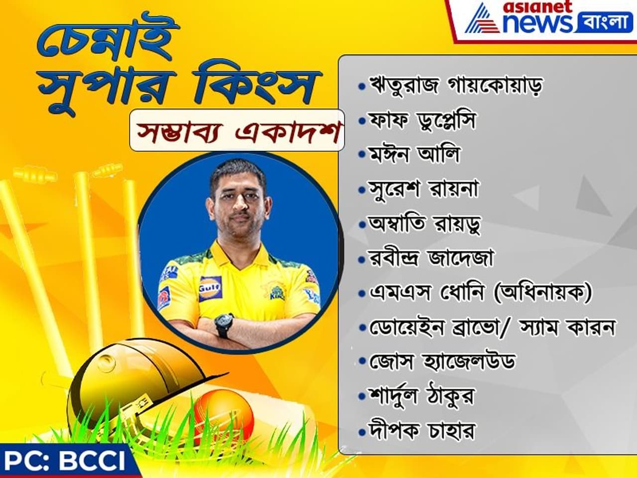 আজকে ধোনি বনাম উইলিয়ামসন মহারণে দুই দলের একাদশ কী হতে পারে তা নিয়ে চলছে জল্পনা। আজকের ম্যাচে সিএসকে দলে একটি মাত্র পরিবর্তন হওয়ার সম্ভাবনা রয়েছে। যেখানে গত ম্য়াচে ছন্দে না থাকা স্যাম কারনের বদলে দলে ফিরতে পারেন ডোয়েইন ব্রাভো। এছাড়া চেন্নাই সুপার কিংসের প্রথম একাদশের ব্যাটিং লাইনআপে থাকতে পারেন ঋতুরাজ গায়কোয়াড়, ফাফ ডুপ্লেসি, মঈন আলি, সুরেশ রায়না, অম্বাতি রায়ডু, এমএস ধোনি (অধিনায়ক ও উইকেট রক্ষক)। দলে অলরাউন্ডারের ভূমিকায় থাকবেন রবীন্দ্র জাদেজা, ডোয়েইন ব্রাভো অথবা স্যাম কারন। এছাড়া বোলিং লাইনে থাকবেন শার্দুল ঠাকুর, দীপক চাহার ও জস হ্যাজেলউড।