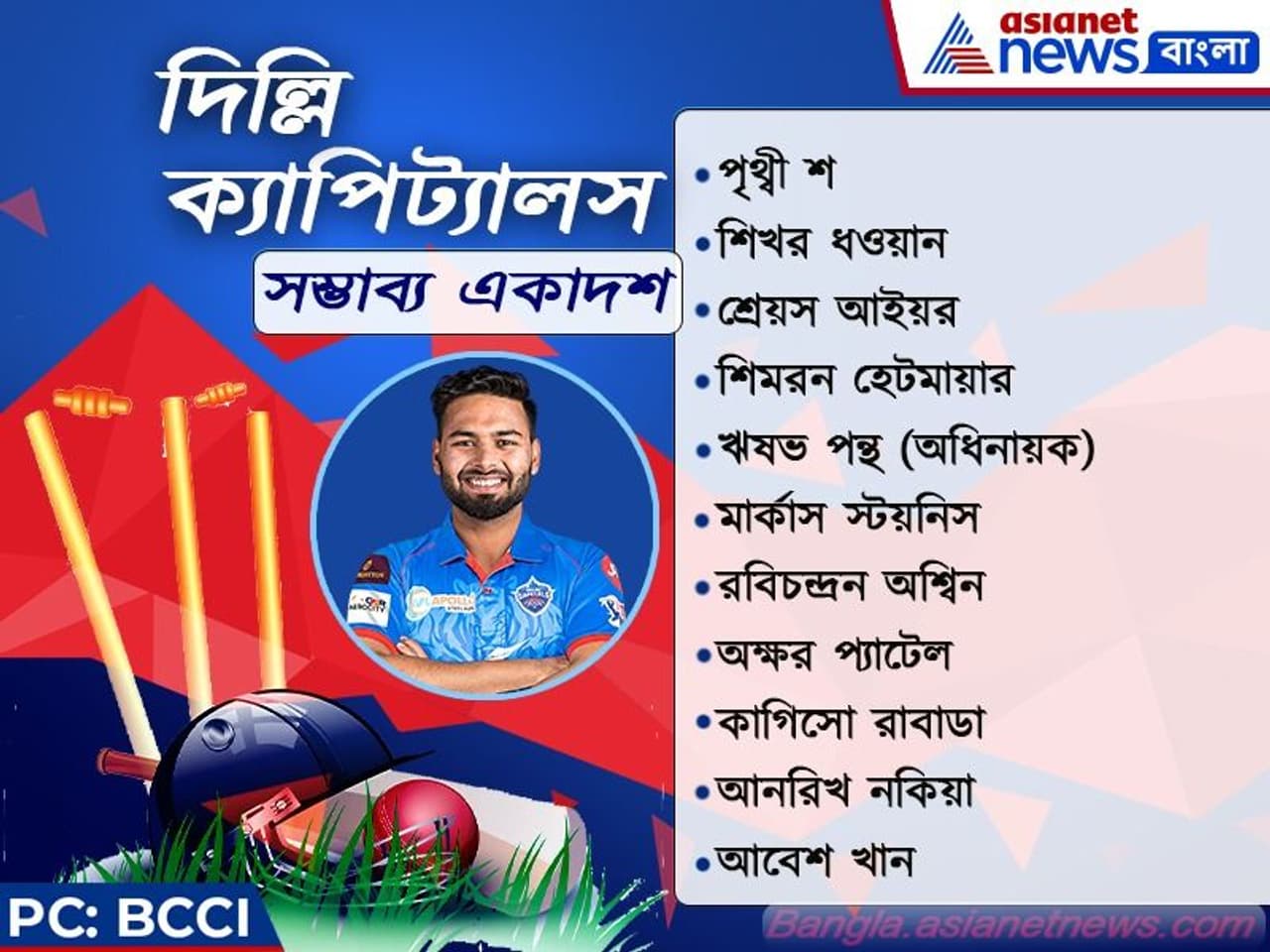 ভারতের মাটিতে প্রথম পর্বে চোটের কারে শেষের দিকে কিছু ম্যাত খেলতে পারেন তৎকালীনন অধিনায়ক শ্রেয়স আইয়র। তার জায়গায় অধিনায়ক করা হয় ঋষভ পন্থ। মরুদেশে চোট সারিয়ে দলে ফিরেছেন শ্রেয়স। তবে অধিনায়কত্বের দায়িত্ব থাকছে পন্থের কাধেই। আজকের ম্য়াচে দিল্লি ক্যাপিটালসের সম্ভাব্য প্রথম একাদশের ব্যাটিং লাইনে থাকতে পারেন শিখর ধওয়ান, পৃথ্বি শ, শ্রেয়স আইয়র, ঋষভ পন্থ , শেমরন হেটমায়ার। অলাউন্ডারের ভূমিকায় থাকতে পারেন মার্কাস স্টয়নিস ও অক্ষর প্যাটেল। স্পিন অ্যাটাককে নেতৃত্ব দেবেনল রবিচন্দ্রন অশ্বিন। পেস অ্যাটাকে থাকবেন আনরিখ নকিয়া, কাগিসো রাবাডা ও আবেশ খান।