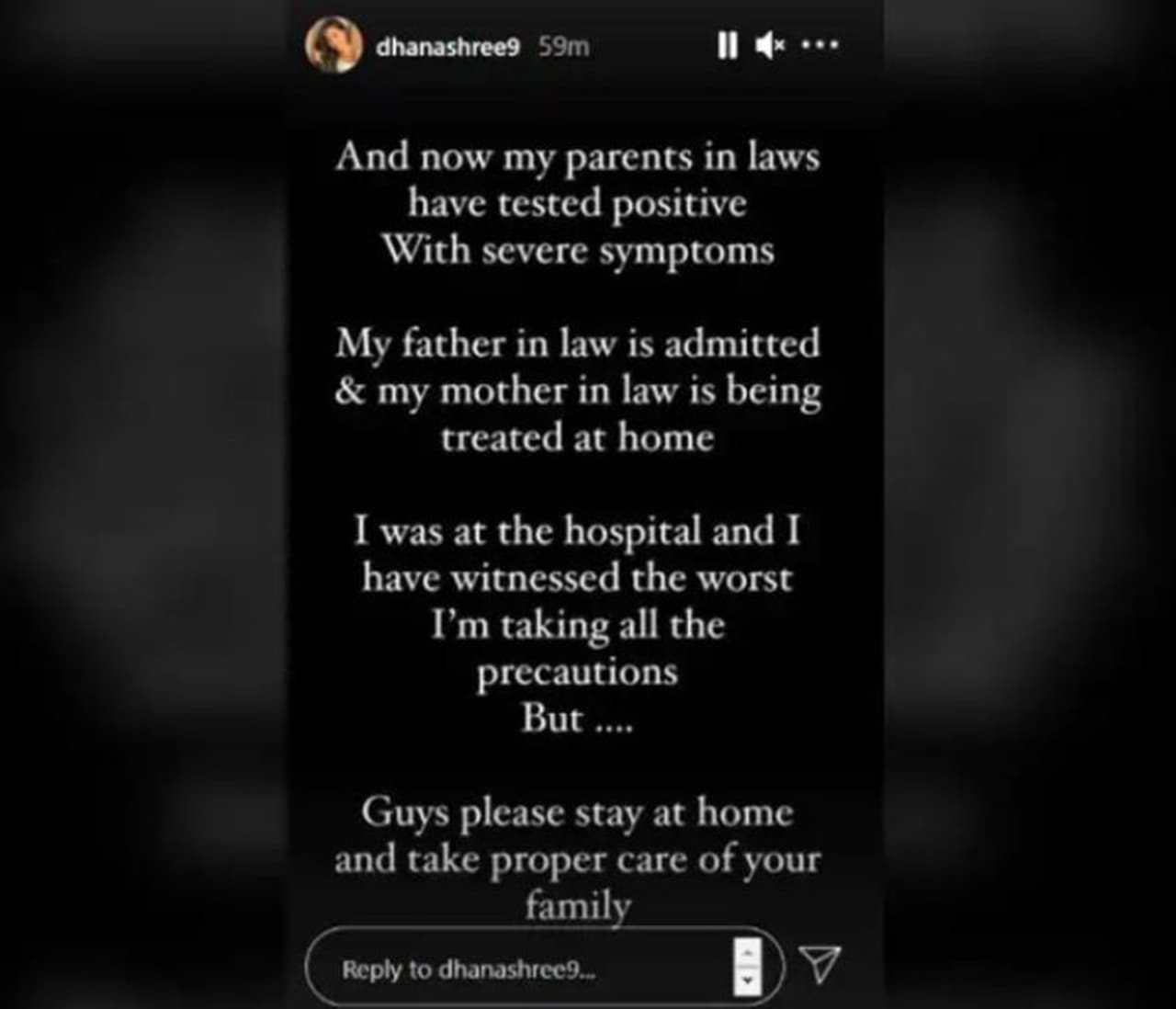 এর আগে ধনশ্রীর মা ও ভাই করোনা আক্রান্ত হয়েছিলেন। তারা এখন সুস্থ রয়েছে। এদিন চাহলের বাবা-মায়ের খব জানাতে গিয়ে ধনশ্রী সোশ্যাল মিডিয়ায় ধনশ্রী লিখেছেন,'আমার শ্বশুর-শাশুড়ি দুজনেরই করোনার উপসর্গ ছিল। রিপোর্ট পজিটিভ। আমি হাসপাতালে গিয়েছিলাম। সেখানে গিয়ে ভয়াবহ অবস্থা দেখলাম। আমরা সব ধরনের সতর্কতা মেনে চলছিলাম। তাও আক্রান্ত হতে হল ওঁদের। সকলে বাড়িতে থাকুন, সুরক্ষিত থাকার চেষ্টা করুন ও পরিবারের যত্ন নিন'। খবর সামনে আসার পর থেকেই ২ জনের দ্রুত আরোগ্য কামনা করেছেন সকলেই।