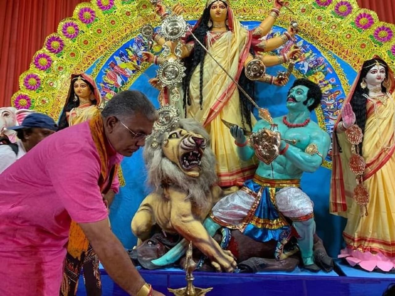 দিলীপ ঘোষ- হ্যাঁ, কোনও বিশেষ ঘটনা হয়ে গেছে হয়তো- সেক্ষেত্রে হয়েছে। কোনও অ্যাক্সিডেন্ট হয়ে গেল বা কিছু হয়ে গেল আমাদের, সেখানে যেতে হয় কিছু করার চেষ্টা করতে হয় ।.সহযোগিতাও করা হল, সমস্যার সমাধানও হল। মানুষ যাতে বেশি বিভ্রান্ত না হন, বিব্রত না হন- পুজোর সময় সেটা দেখার চেষ্টা করি। এক-আধবার সে রকমই হয়েছে। কখনও পুজোর সময় বন্যাও হয়েছে। ইদানিং তো অতটা বন্য হয় না। কিন্তু আগে আমরা দেখেছি দুর্গাপুজোর সময় বন্যা প্রায়ই হতো। কয়েকবছর ওটা হয়নি, যদিও উত্তর বাংলায় দক্ষিণ বাংলায় কিছু জেলাতে বন্যার জল নামেনি। দু তিন বছর আগেও ঘাটাল মেদিনীপুর সবং লাইনে বন্যা হয়েছিল। আমি গেছিলাম সেখানে পুজোর আগে। এত জল জমে গিয়েছিল যে তখনও তা বুক সমান ছিল। আরামবাগ- এইসব এলাকায় বৃষ্টির জন্য বন্যা পরিস্থিতি হয়েছে। গত দু-বছর বৃষ্টি একটু কম। এবছরও কম। জানি না ভগবান কি করবেন সময় আছে। কিন্তু সেবারে কিন্তু খুব বন্যা হয়েছিল দুবার তিনবার করে বন্যা হয়েছিল সেই জায়গায়। সেটা দেখতে গেছি। এইসব ব্যাপার থাকে , সেইসব লোকেদের চিন্তা থাকে যারা বাড়িঘর ছেড়ে অন্য জায়গায় আছেন পুজোর আনন্দ করতে পারছেন না তাদের জামাকাপড় বা অন্যান্য জিনিসের ব্যবস্থা করা এসবগুলো থাকে