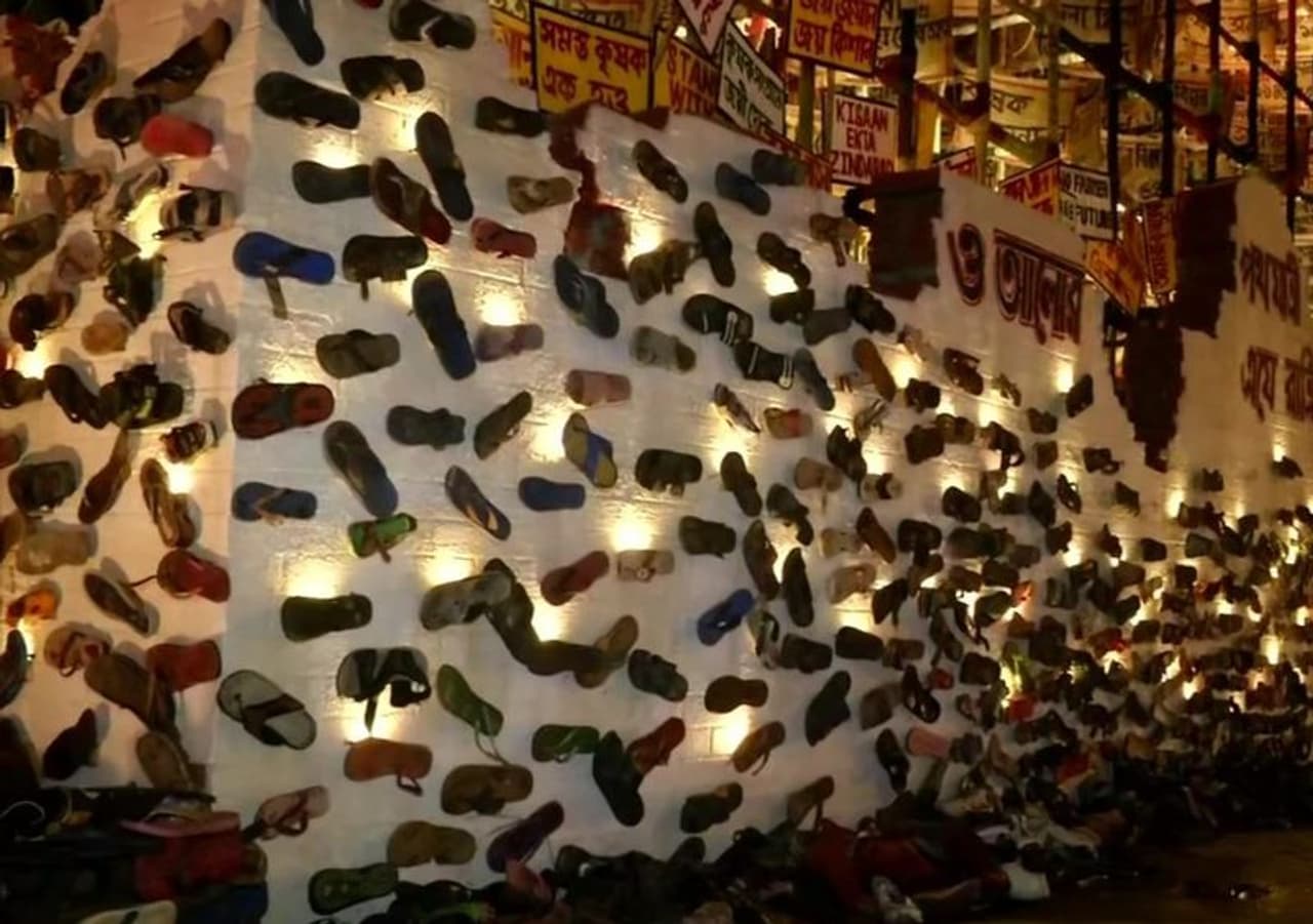 পুজোর মণ্ডপের (Puja Pandal) ভিতরে পরিবেশ একেবারে অন্যরকম। কৃষক আন্দোলন, তাঁদের সমস্যা, তাঁদের উপর হওয়া অত্যাচারের ছবি তুলে ধরা হয়েছে মণ্ডপে। বিভিন্ন সময়ে হওয়া কৃষক আন্দোলনকেই তুলে ধরা হয়েছে এই মণ্ডপের মধ্যে। ফলে মণ্ডপের প্রতিটি কোনায় কৃষকদের যন্ত্রণার চিত্র স্পষ্ট হয়ে উঠেছে।