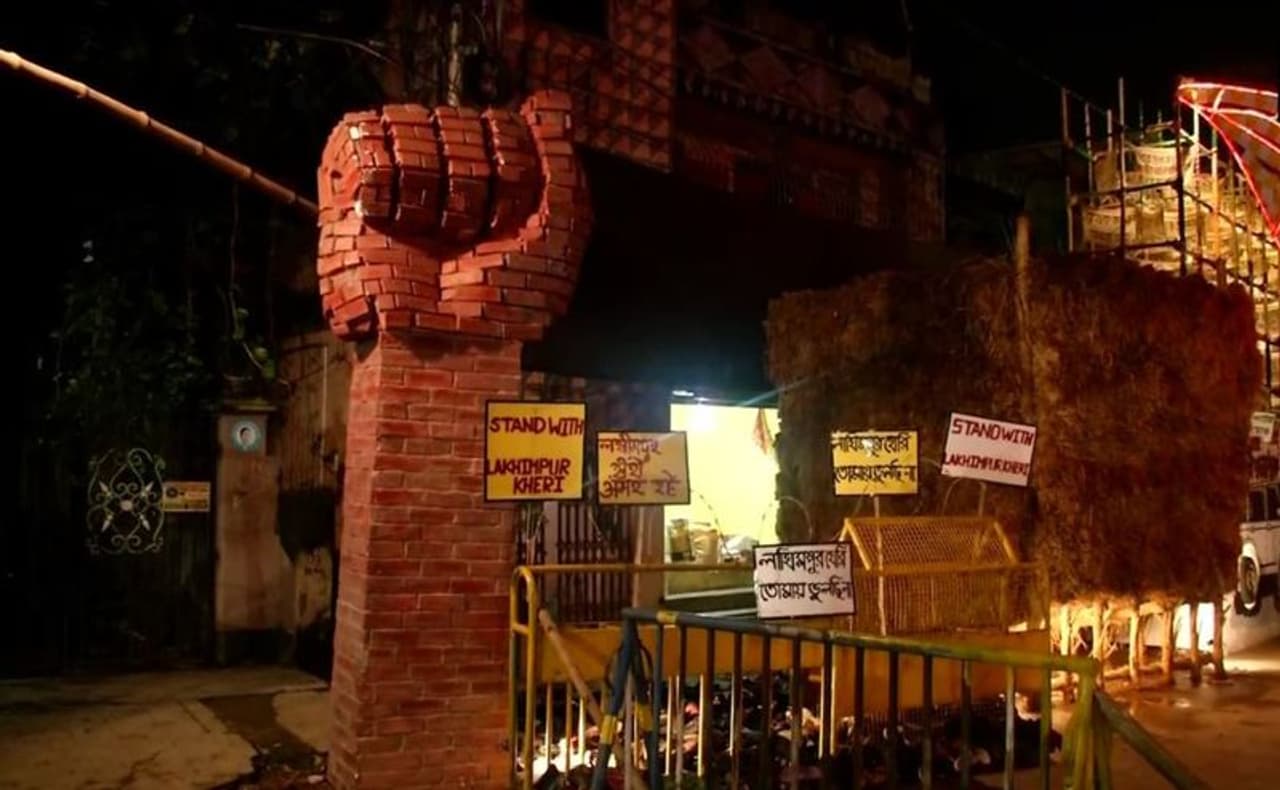 পুজোর মণ্ডপের ভিতরে পরিবেশ একেবারে অন্যরকম। কৃষক আন্দোলন, তাঁদের সমস্যা, তাঁদের উপর হওয়া অত্যাচারের ছবি তুলে ধরা হয়েছে মণ্ডপে।