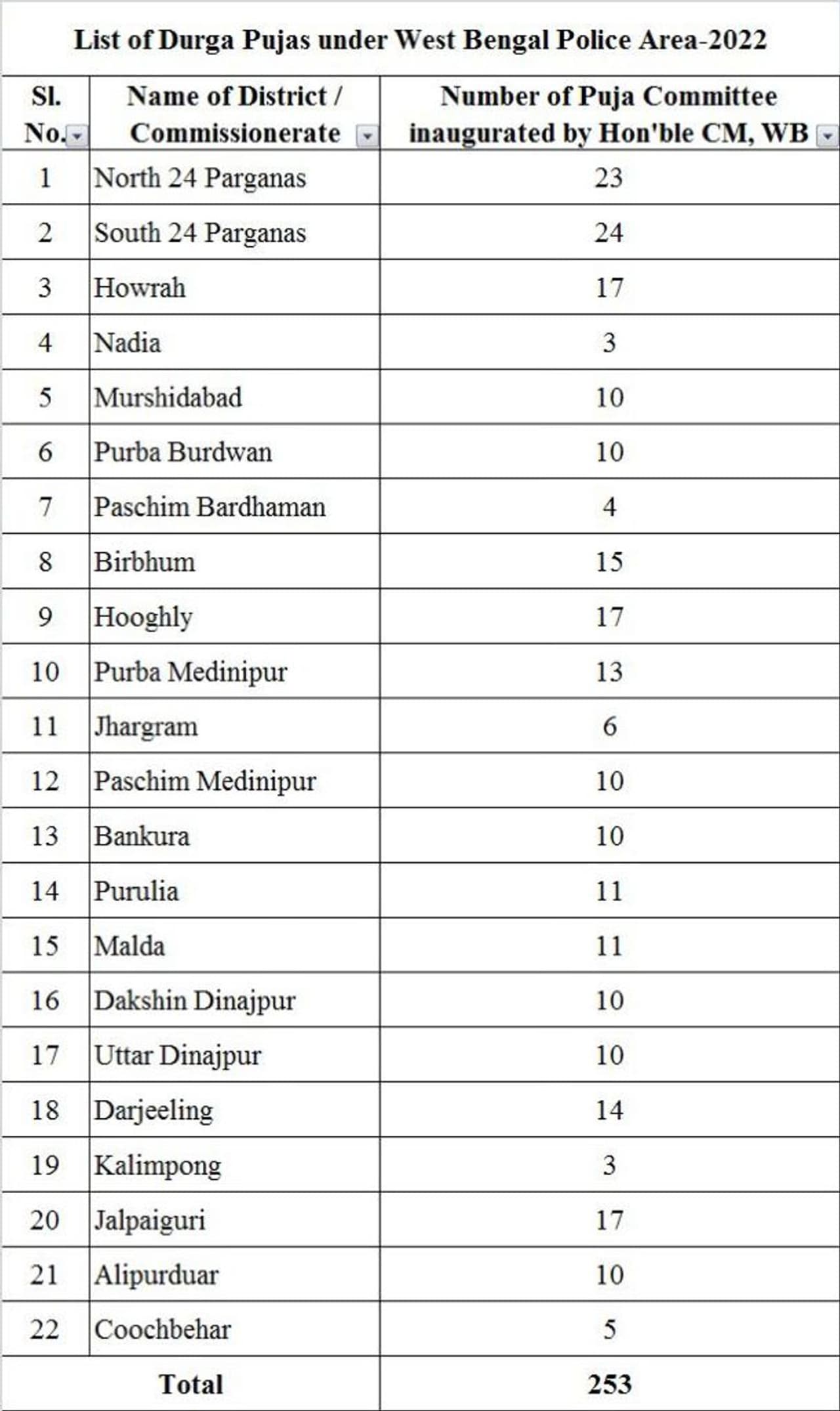 রাজ্যের প্রায় ২৫৩টি ক্লাবের পুজো উদ্বোধন করেন তিনি। এশিয়ানেট নিউজ বাংলার হাতে আসা তথ্য অনুযায়ী মমতা বন্দ্যোপাধ্যায় যেসব পুজো উদ্বোধন করবেন সেগুলি হলঃ