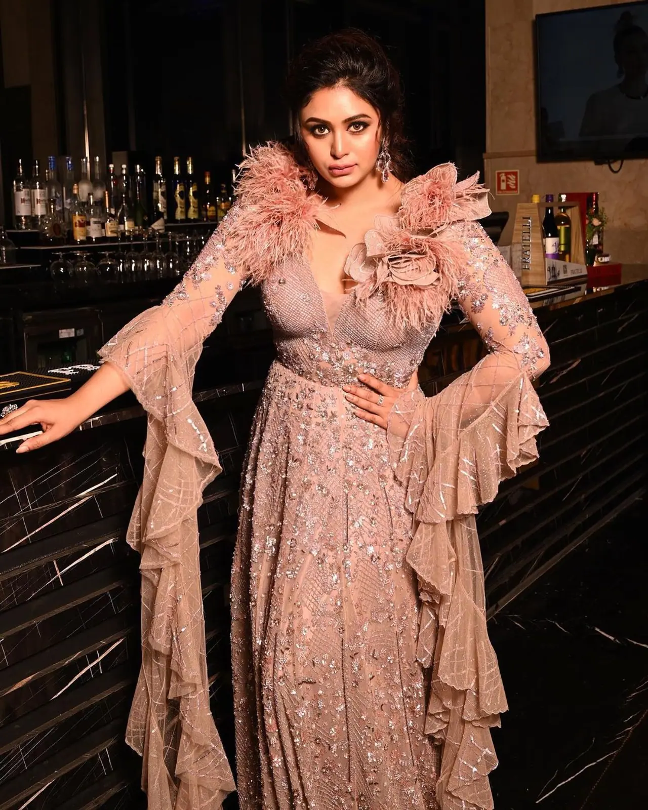 ঝালর দেওয়া গাউনের সঙ্গে, কানে বড় ঝোলা দুল ও হাতে বড় আংটি নজর কেড়েছেন নেটিজেনদের। পোশাকের সঙ্গে ম্যাচ করে গ্লিটারস আইশ্যাডো এবং কাজল কালো চোখের চাহনিতে পাগল করেছেন ভক্তরা।