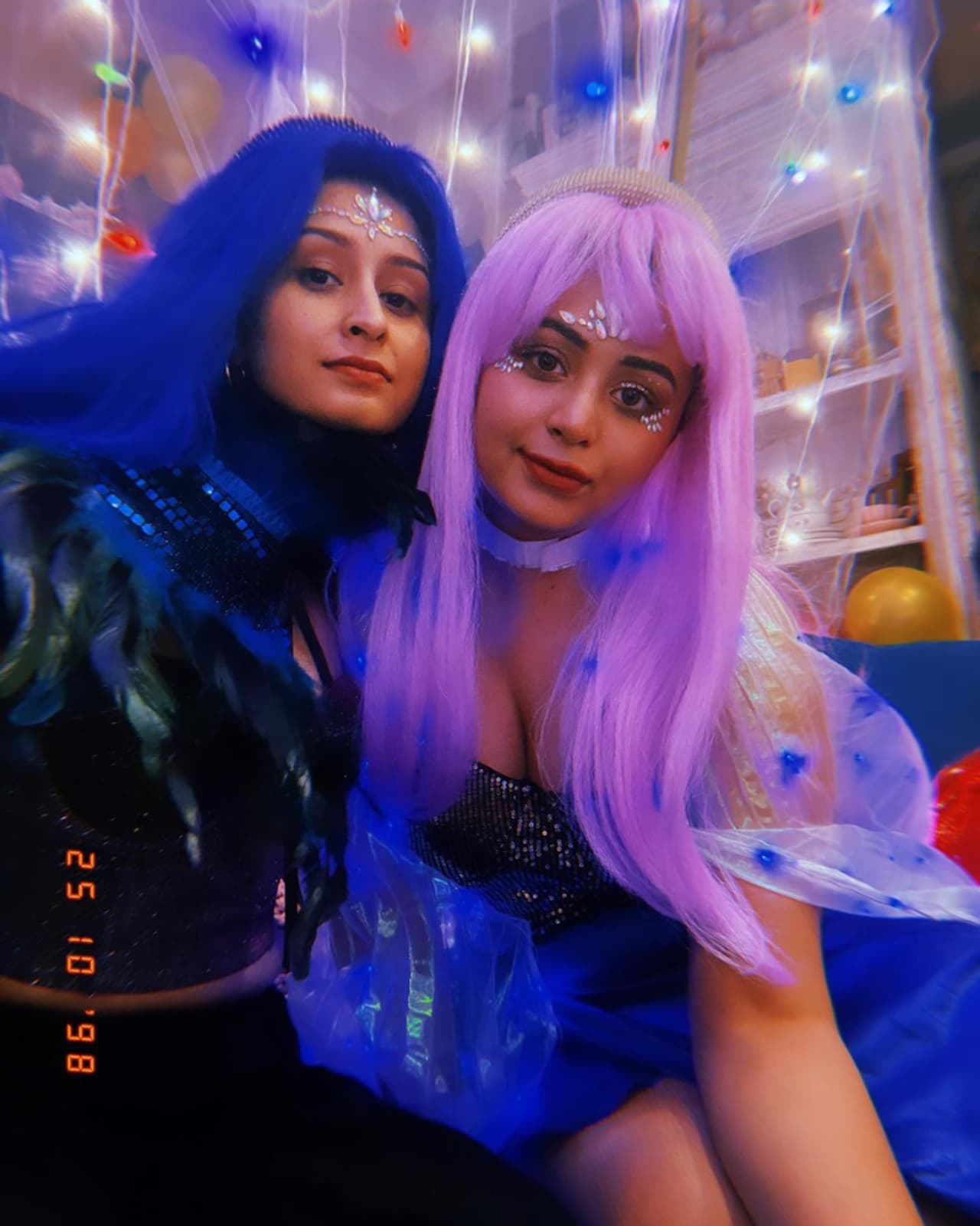 সদ্য হ্যালোইন পার্টির সাজে দেখা দিলেন ঋতাভরী চক্রবর্তী। সঙ্গে ছিলেন তাঁর দিদি। স্কাই রঙের পোশাক পরেন ঋতাভরী চক্রবর্তী। মাথায় ছিল একই রঙের পরচুল। চোখা গাঢ় মেকআপ আর ঠোঁটে ডার্ক লিপস্টিক। পোশাকের ভিতর দিয়ে উঁকি দিচ্ছিল তাঁর ক্লিভেজ।