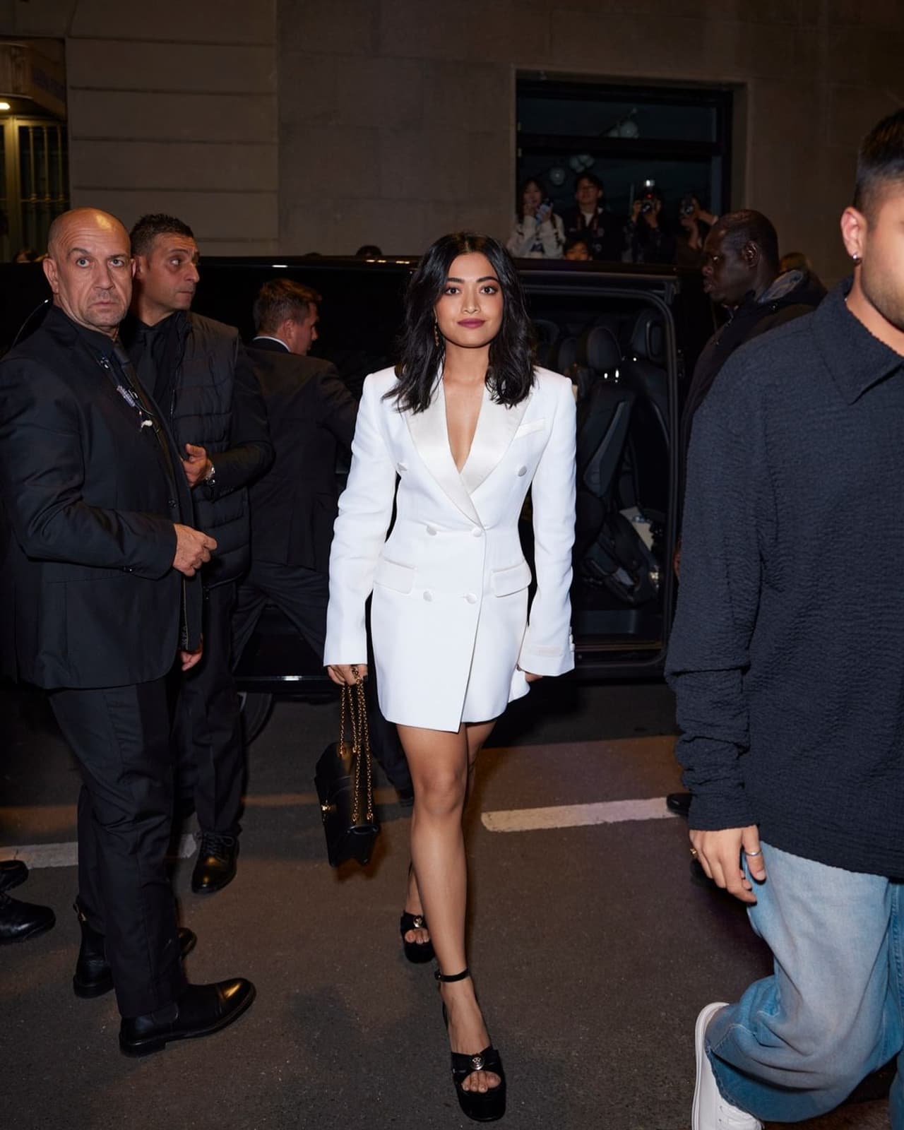 ডোনাটেলা ভার্সেস ইনস্টাগ্রামে কিছু বিশেষ ছবি শেয়ার করেছেন, যার মধ্যে রয়েছে রশ্মিকা মন্দান্নার সাথে একটি অসাধারণ ছবি। এই আড়ম্বরপূর্ণ অনুষ্ঠানের জন্য রশ্মিকা সাদা-ক্রিম রঙের মিশ্রণে তৈরি ব্লেজার পোশাক পরেছিলেন। এই পোশাকটিতে রয়েছে সুন্দর ল্যাপেল, চতুর্ভুজাকার প্যাডেড কাঁধ, লম্বা হাতা এবং আড়ম্বরপূর্ণ কোট পকেট, যা রশ্মিকার গায়ে খুব সুন্দর দেখাচ্ছিল। এর সাথে মানানসই কালো রঙের ব্যাগ নিয়েছিলেন।