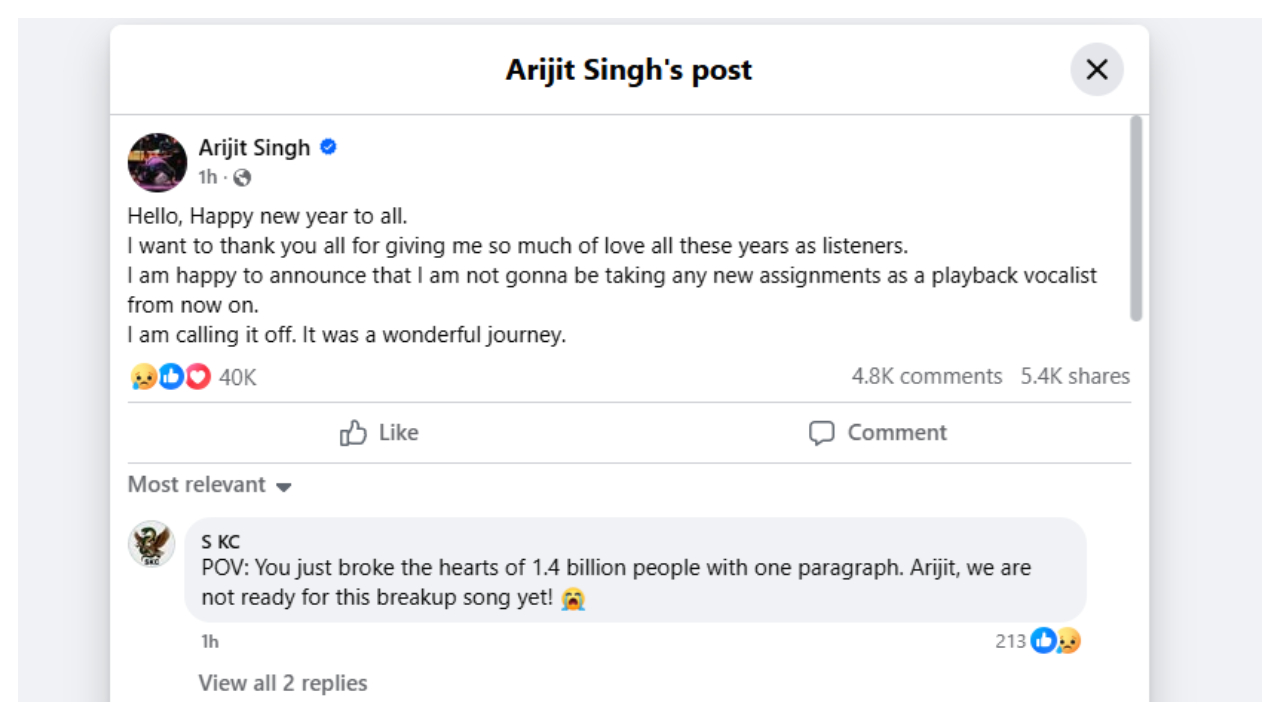 অরিজিৎ সিং লিখেছেন, 'হ্যালো, সকলকে নববর্ষের শুভেচ্ছা। এত বছর ধরে শ্রোতারা, যে হিসেবে আমাকে অকুন্ঠ ভালবাসা দিয়েছেন, তার জন্য আমি কৃতজ্ঞ। আনন্দের সঙ্গে জানাচ্ছি এখন থেকে আমি আর প্লেব্যাক ভোকালিস্ট হিসেবে নতুন কোনও অ্যাসাইনমেন্ট নেব না। এই অধ্যায় এখানেই শেষ করেছিল। এটি ছিল অসাধারণ যাত্রা। আর ঈশ্বর আমার প্রতি সত্যি দয়ালু ছিলেন। '