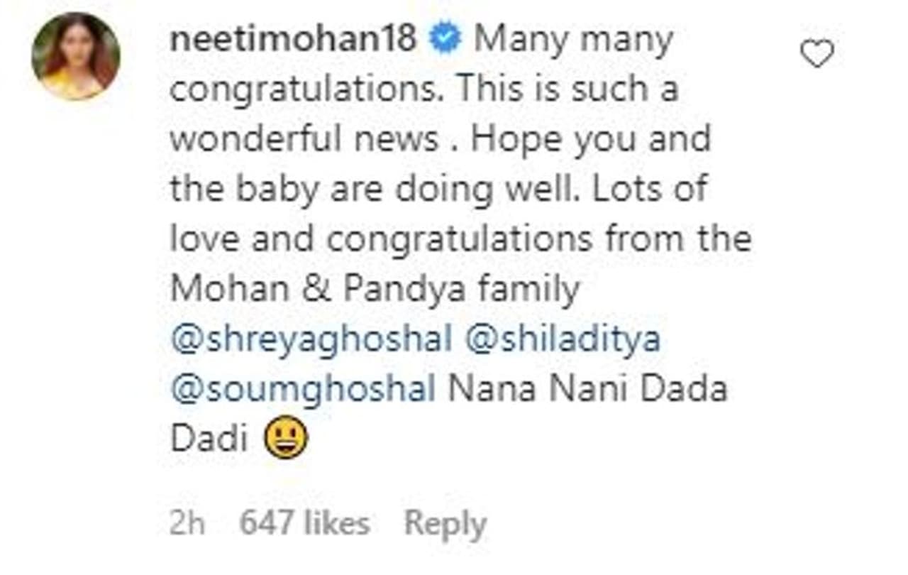 নীতি মোহন তাঁকে শুভেচ্ছা বার্তা দিয়ে জানিয়েছেন, 'এটি একটি দুর্দান্ত খবর। আশা করি তুমি এবং তোমার সন্তান ভালো আছে। মোহন ও পান্ড্য পরিবার থেকে প্রচুর ভালবাসা এবং অভিনন্দন।'