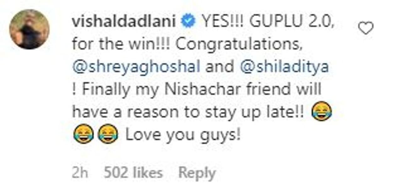 বিশাল দাদলানি তাঁকে শুভেচ্ছাবার্তা দিয়ে জানিয়েছেন, অবশেষে আমার নিশাচর দুই বন্ধুর রাত জাগার কারণ তৈরি হল।