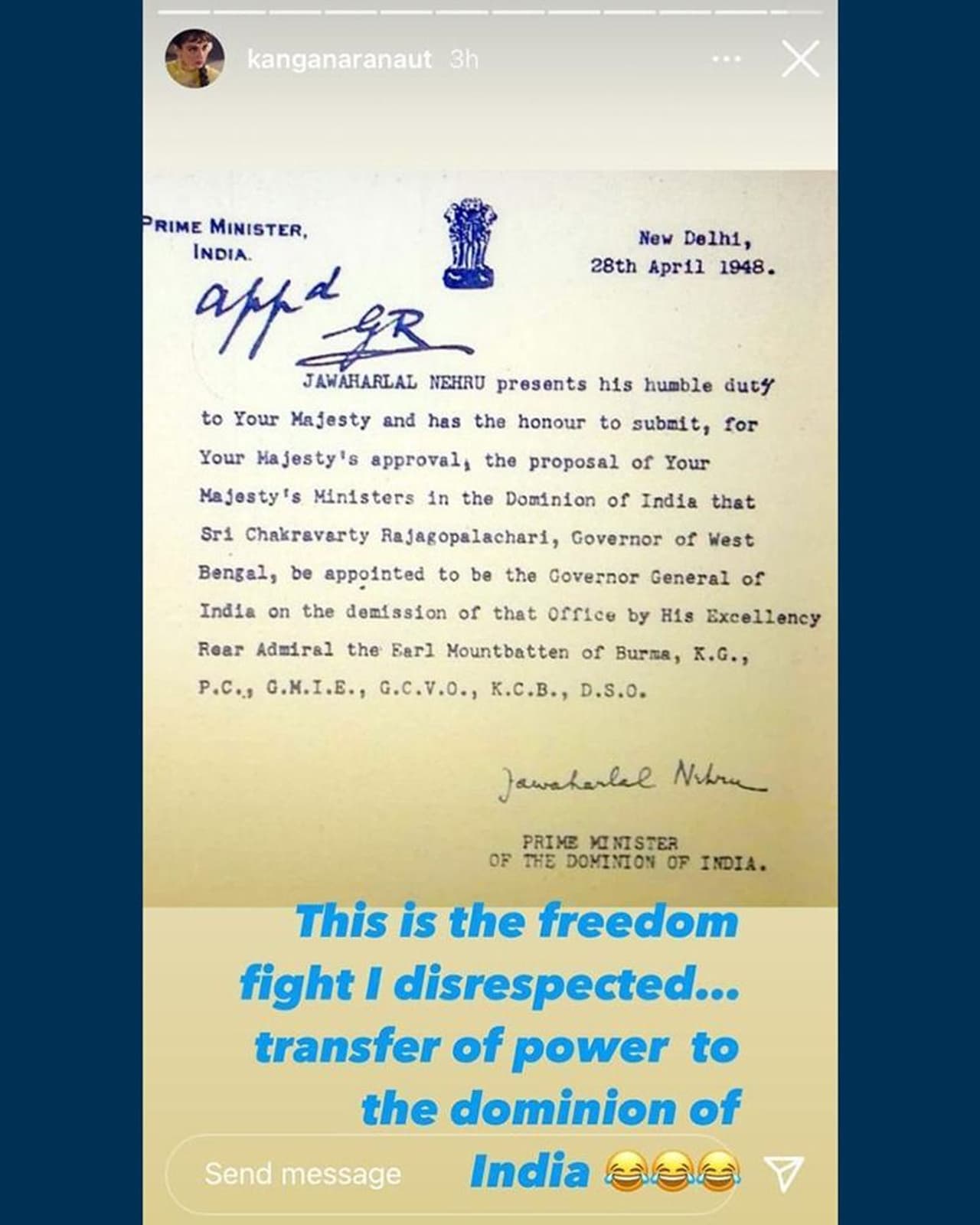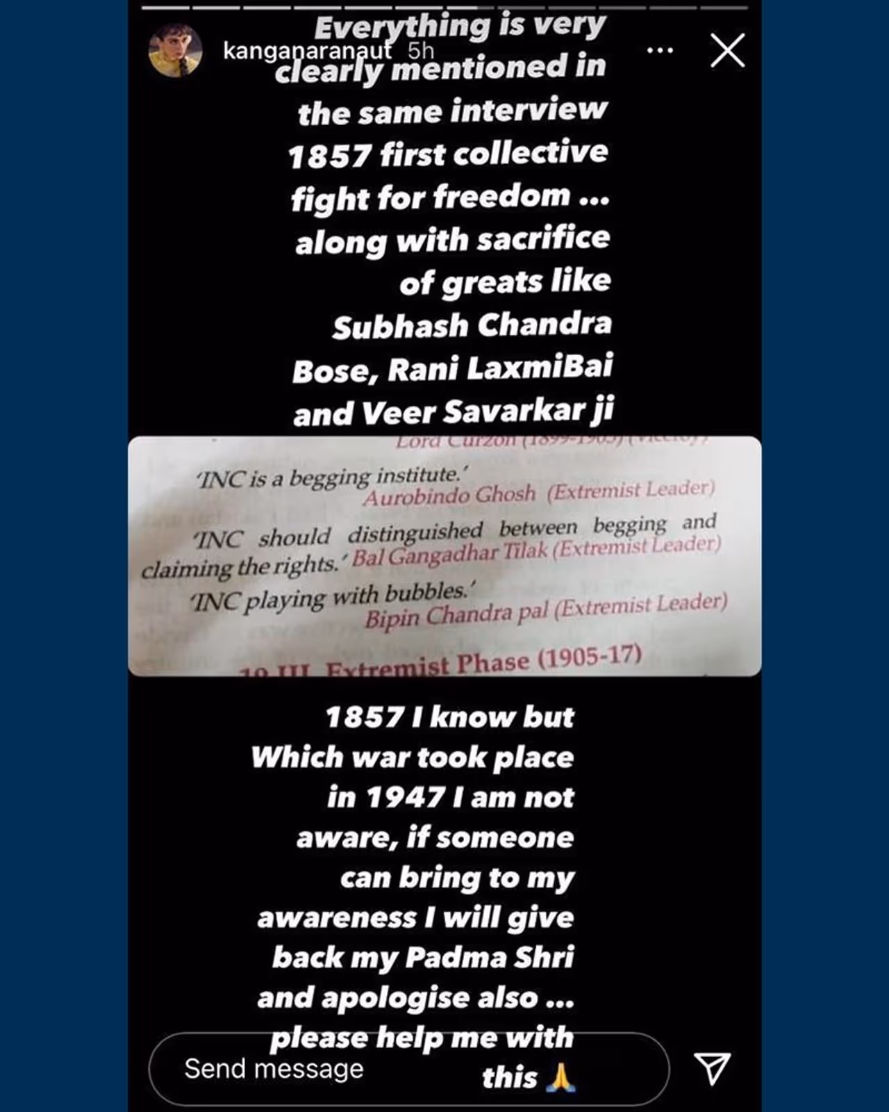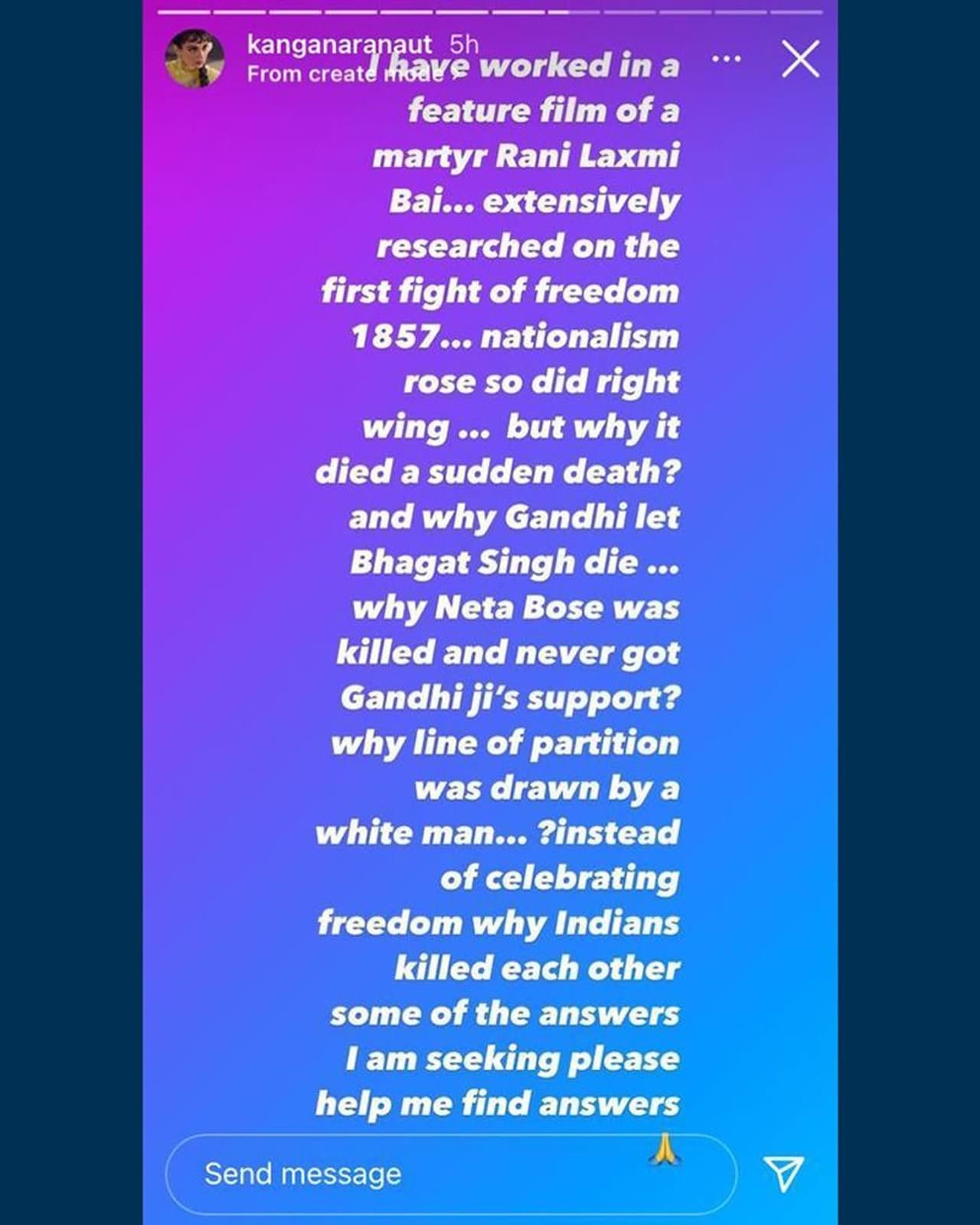 এখানেই থেমে থাকেন নি অভিনেত্রী। নিজের ইনস্টাগ্রামে (Instagram) গর্জনের সুরে কঙ্গনা লেখেন, 'আমি শহিদ রানি লক্ষ্মীবাঈয়ে (Rani Laxmibai) উপর ছবিতে কাজ করেছি। তখন ১৮৫৭ সালের যুদ্ধ নিয়ে অনেক রিসার্চও করেছি। সেই সময় প্রথম ন্যাশনালিজমের জন্ম হয়, রাইট উইং সামনে আসে। কিন্তু হঠাত করেই তা মরে গেল কেন? কেন গান্ধীজী ভগৎ সিংকে মরতে দিলেন? কেন নেতা বসুকে মেরে ফেলা হল? কেন নেতাজী গান্ধীজীর কোনও সাপোর্ট পেলেন না? এক সাদা চামড়ার ব্যক্তিকে কেন দেশ ভাগ করার অধিকার দেওয়া হল? স্বাধীনতা সেলিব্রেট করার পরিবর্তে কেন ভারতীয়রা একে অপরকে খুন করতে লাগলেন? আমি এই সব প্রশ্নের উত্তর খুঁজছি। কেউ আমাকে প্লিজ সাহায্য করুন।