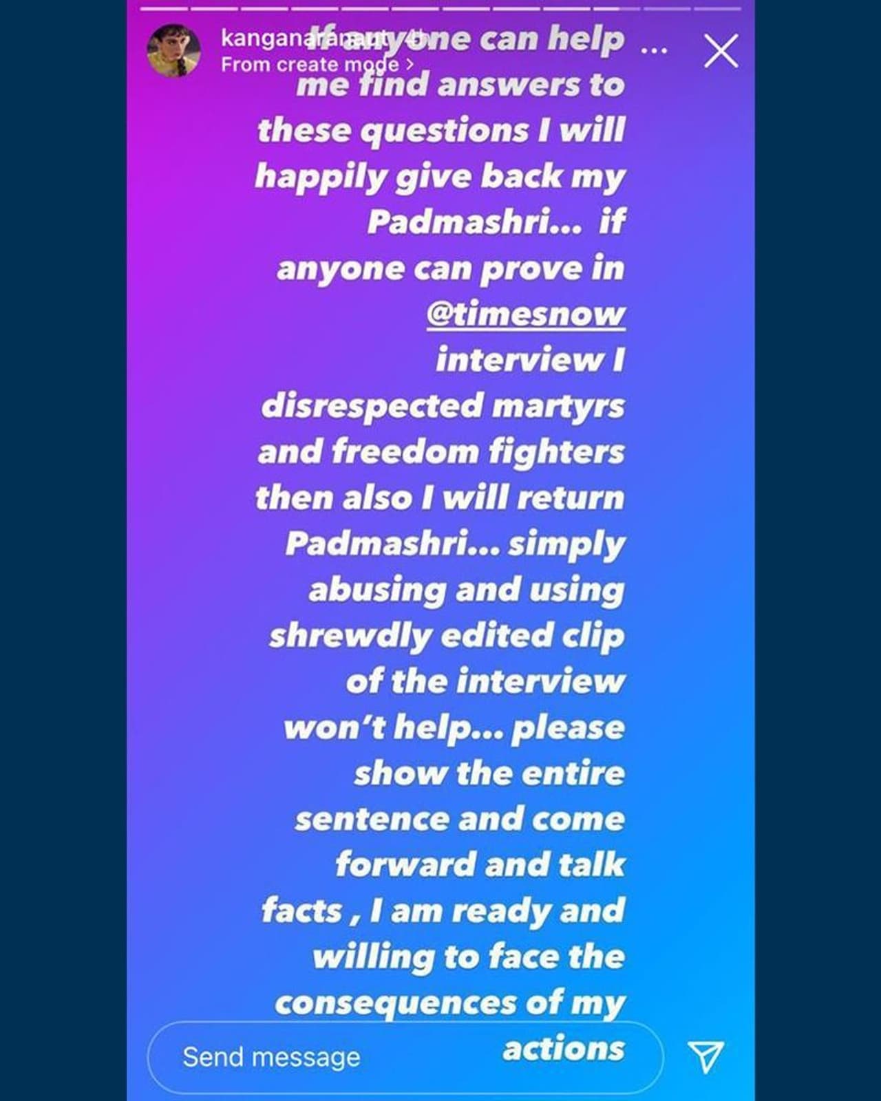 সম্প্রতি দেশের স্বাধীনতা নিয়ে বিতর্কে জড়িয়েছেন বলিউড অভিনেত্রী কঙ্গনা রানাউত। একটি জনপ্রিয় সংবাদ মাধ্যমের অনুষ্ঠানে এসে কঙ্গনা জানান '২০১৪ সালে দেশ স্বাধীন হয়েছে।' এরপরই কঙ্গনার পদ্মশ্রী সম্মান ফিরিয়ে নেওয়ার দাবি উঠতে শুরু করে। এবার সেই বিতর্কে মুখ খুললেন কঙ্গনা।