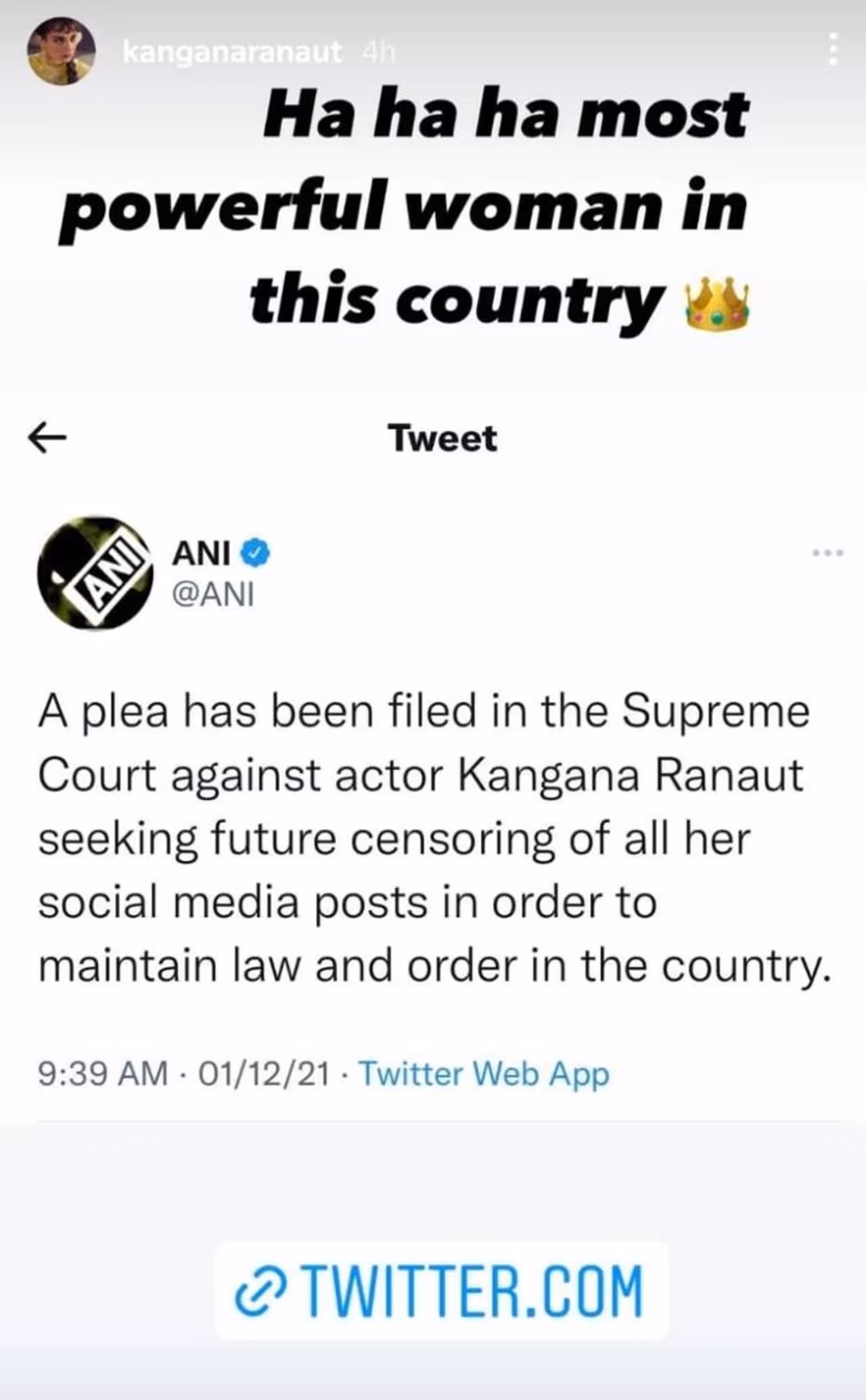 তবে এবার এএনআই (ANI) সূত্রে খবর, দেশের আইন-শৃঙ্খলা বজায় রাখতে কঙ্গনার (Kangana Ranaut) সোশ্যাল মিডিয়ায় (Social Media) নজরদারির আবেদন জানানো হয়েছে। আর তারপর নিজের ইনস্টাগ্রাম প্রোফাইলে (Instagram Profile) ফের আরও এক বিতর্কিত মন্তব্য করে বসলেন কঙ্গনা। তাঁকে নিয়ে প্রকাশিত সংশ্লিষ্ট খবরের একটি স্ক্রিনশট নিজের ইনস্টা স্টোরিতে (Instagram Story) শেয়ার করেছেন কঙ্গনা (Kangana Ranaut) এবং সেখানে লিখেছেন যে, 'হা হা হা, এই দেশের সবচেয়ে শক্তিশালী মহিলা আমি।' সেইসঙ্গে পাশে একটা মুকুটের ইমোজিও শেয়ার করেছেন অভিনেত্রী।