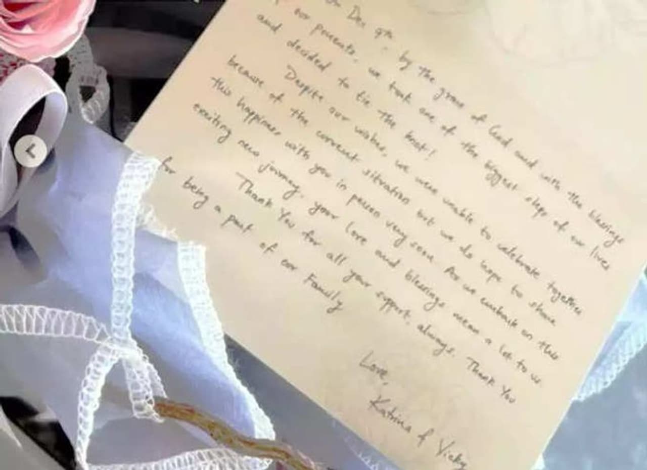 '৯ ডিসেম্বার ভগবান এবং আমাদের মা-বাবার ও পরিবারের আশীর্বাদ নিয়ে আমরা জীবনের সবচেয়ে বড় পদক্ষেপ করেছি। বিয়ের সিদ্ধান্ত নিয়েছি। আমাদের একান্ত ইচ্ছা ছিল বিয়েতে সবাই একসঙ্গে আনন্দ করব, কিন্তু বর্তমান পরিস্থিতি সেই অনুমতি দেয়নি। কিন্তু আশা রাখছি, আগামীদিনে আমরা একসঙ্গে হয়ে সেলিব্রেট করতে পারব। আমাদের নতুন সফরে আপনাদের ভালোবাসা ও আশীর্বাদের অপেক্ষায় থাকব। যে সাপোর্ট আর ভালোবাসা আপনাদের থেকে পেয়েছি, তার জন্য আমরা কৃতজ্ঞ। আমাদের পরিবারের অংশ হওয়ার জন্য অনেক অনেক ধন্যবাদ। লাভ ক্যাটরিনা এবং ভিকি (Love Kayrina & Vicky)।'
