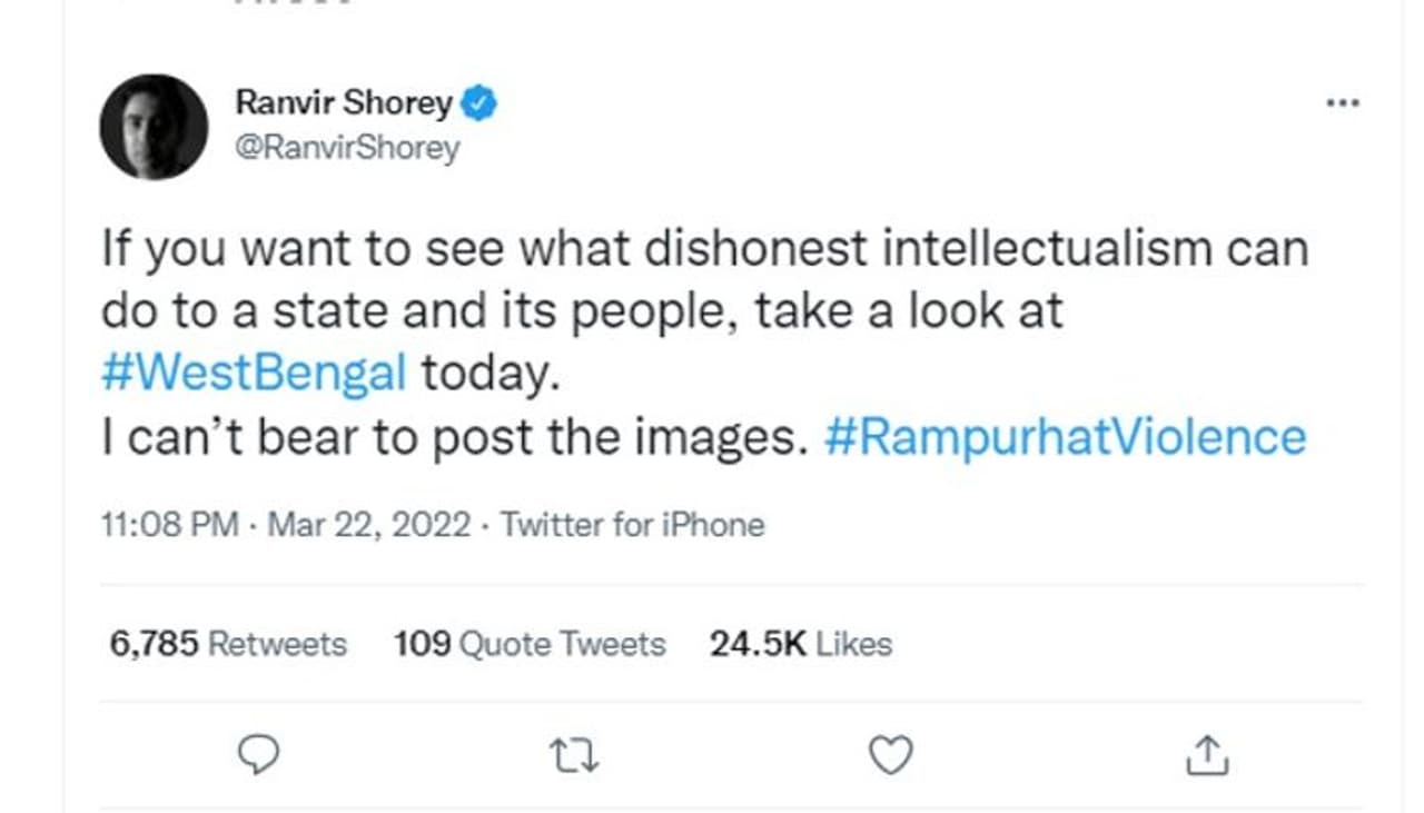 বলি-স্টারের টুইটার ঘাঁটলে স্পষ্ট হয়ে যায় রণবীর শোরে নরেন্দ্র মোদীর একজন অনুগামী। রাজনীতির থেকে তিনি ক্রোডেলেই বেশি স্বাচ্ছান্দ্য। কিন্তু হঠাৎ করে রামপুরহাটের ঘটনা নিয়ে তাঁর রাজনৈতিক টুইট কিছুটা দৃষ্টি আকর্ষণ করেই । তাঁর এই মন্তব্য যথেষ্ট রাজনৈতিক। অনেকেই তাঁর বার্তা পছন্দ করেছেন ও শেয়ার করেছেন। বেশ কিছু নেটবাসী রণবীর শোরের বার্তার উত্তরও দিয়েছেন। যেখানে তাঁরা রাজ্যে ঘটে যাওয়া এই নৃশংস ঘটনার তীব্র নিন্দা করেছেন তাঁরা।