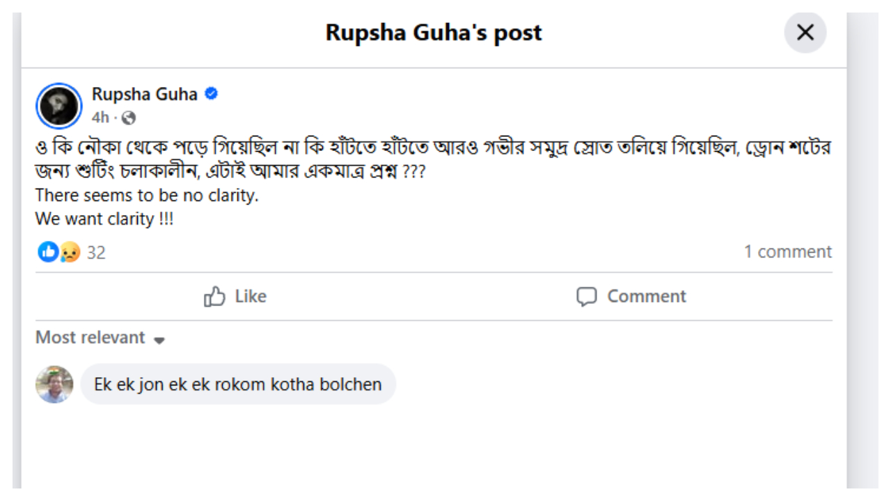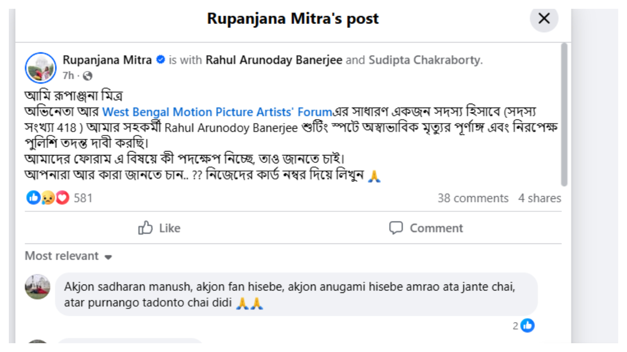 টালিগঞ্জের পরিচিত মুখ রুপসা গুহ। তিনি ঘনিষ্ট মহলে জানিয়েছেন, রাহুলের মৃত্যুর খবর প্রথমে শুনে তিনি বিশ্বাস করতে পারননি। সোশ্য়াল মিডিয়ায় রুপসা লিখেছেন, 'ও কি নৌকা থেকে পড়ে গিয়েছিল না কি হাঁটতে হাঁটতে আরও গভীর সমুদ্র স্রোত তলিয়ে গিয়েছিল, ড্রোন শটের জন্য শুটিং চলাকালীন, এটাই আমার একমাত্র প্রশ্ন ???
