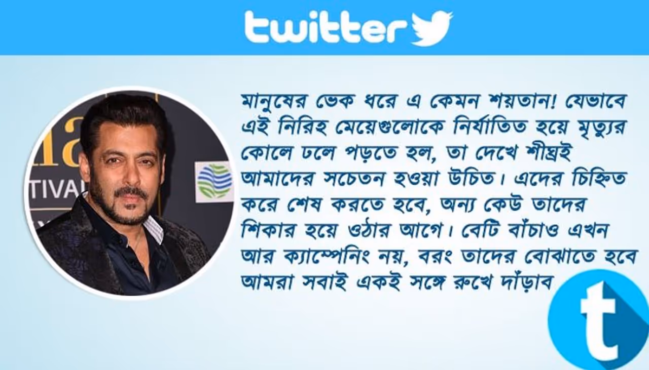 খবর পাওয়া মাত্রই সোশ্যাল মিডিয়ায় সরব হলেন সলমন খান। এদিন তিনি ঘটনার তীব্র প্রতিবাদ করে লেখেন-মানুষের ভেক ধরে এ কেমন শয়তান! যেভাবে এই নিরিহ মেয়েগুলোকে নির্যাতিত হয়ে মৃত্যুর কোলে ঢলে পড়তে হল, তা দেখে শীঘ্রই আমাদের সচেতন হওয়া উচিত। এদের চিহ্নিত করে শেষ করতে হবে, অন্যকেউ তাদের শিকার হয়ে ওঠার আগে। বেটি বাঁচাও এখন আর ক্যাম্পেনিং নয়, বরং তাদের বোঝাতে হবে আমরা সবাই একই সঙ্গে রুখে দাঁড়াব।