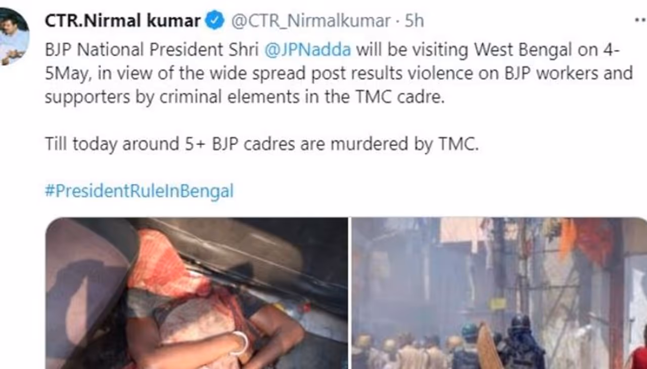 অনেকটাই একই ছবি পোস্ট করেন বিজেপির আইটি সেলের এক কর্তা। নেট দুনিয়ায় তিনি পরিচিত সিটিআর নির্মাল কুমার নামে। তিনিও বেশ কয়েকটি টুইট করেন রাজ্যের ভোট সন্ত্রাসের অভিযোগ তুলে। সোশ্যাল মিডিয়ায় পোস্টেও তিনি তিনি প্রিয়াঙ্ক কাশ্যপের মতই উষ্মা প্রকাশ করেন আগামী পাঁচ বছর রাজ্যের রাজনৈতিক পরিস্থিতি কিরকম থাকবে- তা নিয়ে। তিনি বাংলার সন্ত্রাস নিয়ে একটি নয় একাধিক বার্তা দিয়েছেন তাঁর সোশ্যাল মিডিয়া হ্যান্ডেল থেকে।