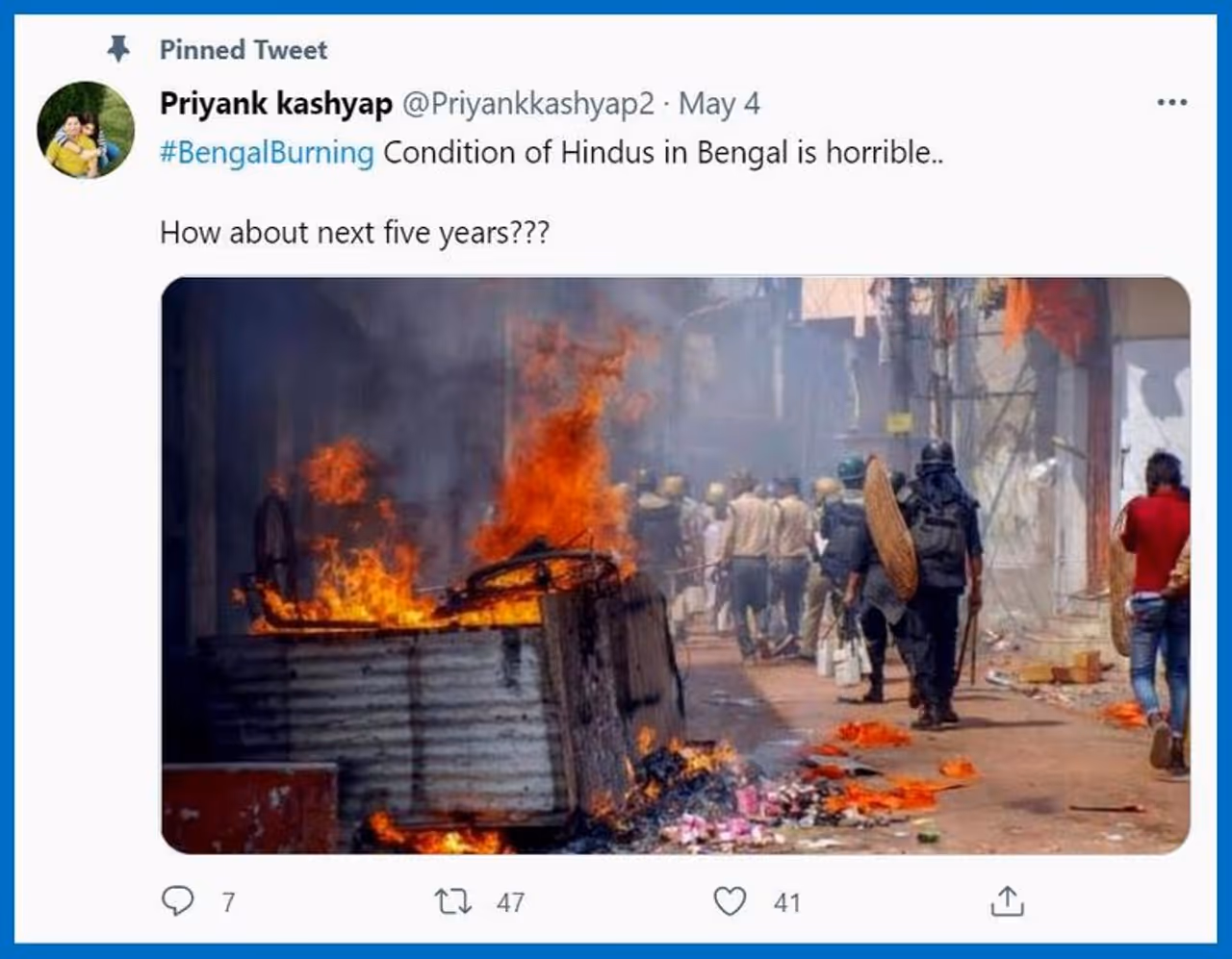 প্রিয়াঙ্ক কাশ্যপ নামের এক মহিলা সোশ্যাল মি়ডিয়ায় একটি অগগ্নিগর্ভ ছবি পোস্ট করেন। তাঁর দাবি ছবিটি বাংলার অগ্নিগর্ভ পরিস্থিতির। তিনি আরও বলেন সেখানে মোটেও নিরাপদে নেই হিন্দুরা। আগামী পাঁচ বছর রাজ্যে কী হবে? তা নিয়েও আশঙ্কা প্রকাশ করেছেন নেটিজেন।