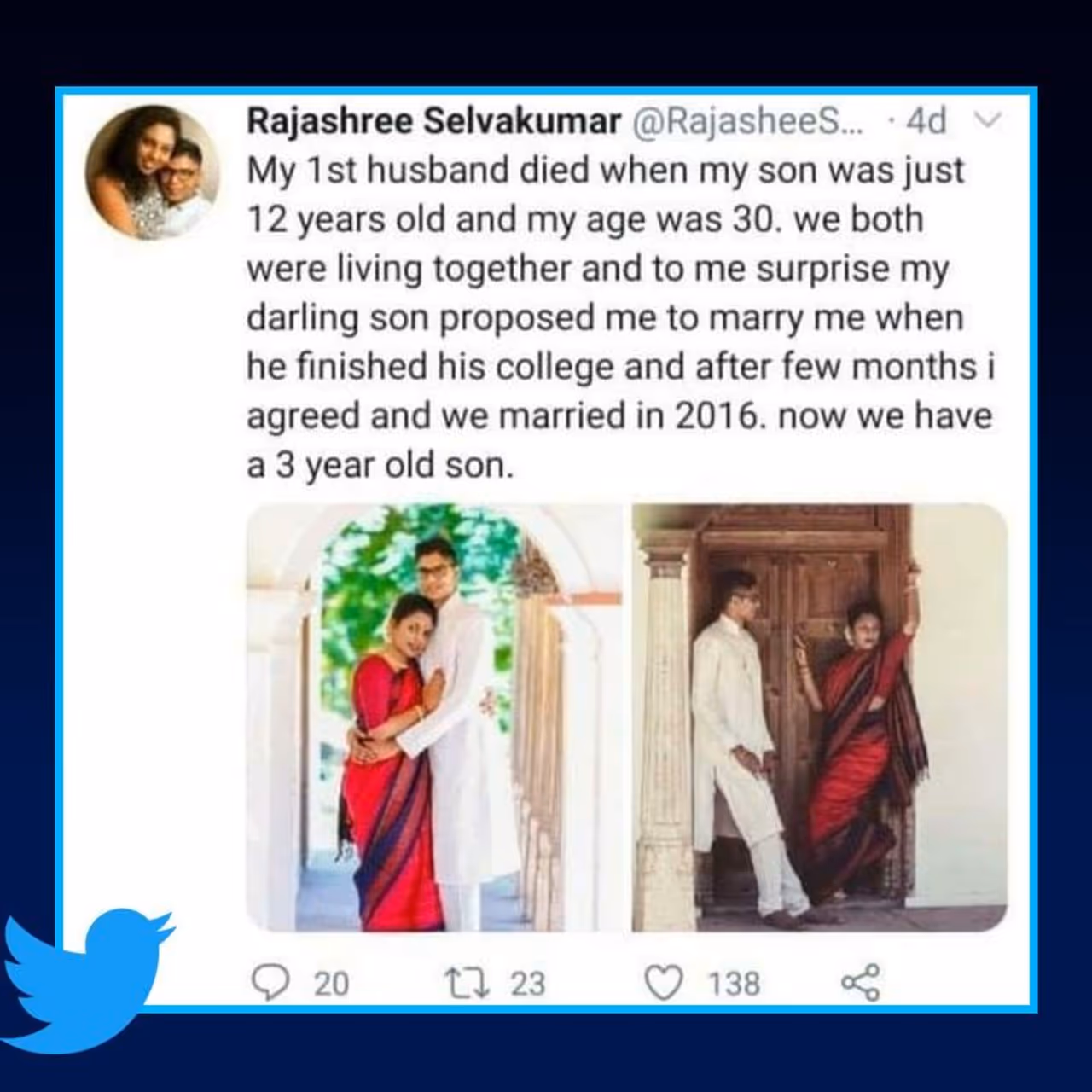 সোশ্যাল মিডিয়ায় রীতিমত ভাইরাল হয়ে গিয়েছিল এক মাতা-পুত্রের বিয়ের গল্প। যা নিয়ে রীতিমত অস্বস্তিতে পড়েছিল গোটা পরিবার। সোশ্যাল মিডিয়ায় রাজশ্রী সেল্ভাকুমারের প্রোফাইল থেকে বলা হয়েছিল 'আমার প্রথম স্বামী যখন মারা গিয়েছিলেন তখন আমার পুত্রের বয়স ছিল মাত্র ১২ বছর, তখন আর আমার ৩০। আমরা দুজনে একসঙ্গে থাকতাম। কিন্তু আমার পুত্র তার কলেজের পড়া শেষ করে আমাকে বিয়ের প্রস্তাব দেয়। সত্যি আমি তখন খুব অবাক হয়েগিয়েছিলাম। কিন্তু কয়েক মাস পরে আমি আমার পুত্রের প্রস্তাবে সম্মত হই। আমরা বিয়ে করি ২০১৬ সালে। বর্তমানে আমাদের একটি ৩ বছরের পুত্র সন্তান রয়েছে।'