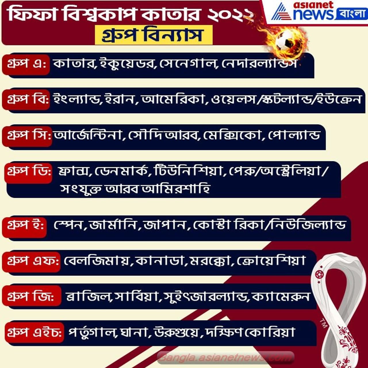 এবার বিশ্বকাপের যে গ্রুপ বিন্যাস হয়েছে তাতে গ্রুপ এ -তে রয়েছে কাতার, ইকুয়েডর, সেনেগাল, নেদারল্যান্ডস। গ্রুপ বি-তে রয়েছে ইংল্যান্ড, ইরান, আমেরিকা, ইউরো প্লে-অফ থেকে ওয়েলস/স্কটল্যান্ড/ইউক্রেনের মধ্যে এক দেশ। গ্রুপ সি-তে রয়েছে মেসির আর্জেন্টিনা। এছাড়া রয়েছে সৌদি আরব, মেক্সিকো, পোল্যান্ড। গ্রুপ ডি-তে রয়েছে গতবারের বিশ্বকাপ জ ফ্রান্স, আইসি প্লে-অফের পেরু/অস্ট্রেলিয়া/সংযুক্ত আরব আমিরশাহি, ডেনমার্ক, তিউনিশিয়া। গ্রুপ ই-তে রয়েছে স্পেন, আইসি প্লে-অফ ২-এর কোস্টা রিকা/নিউজিল্যান্ড, জার্মানি, জাপান। গ্রুপ এফ-তে রয়েছে বেলজিয়াম, কানাডা, মরক্কো, ক্রোয়েশিয়া। গ্রুপ জি- তে রয়েছে নেইমারের ব্রাজিল, সার্বিয়া, সুইজারল্যান্ড, ক্যামেরুন। গ্রুপ এইচ-তে রয়েছে পর্তুগাল, ঘানা, উরুগুয়ে, কোরিয়া রিপাবলিক।