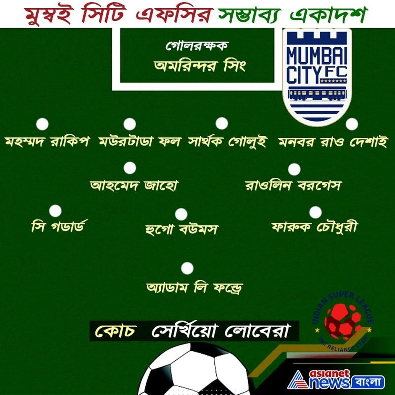 অপরদিকে লিগে এখনও পর্যন্ত দুটি ম্যাচ খেলেছে মুম্বই সিটি এফসি। একটি ম্যাচে জয় ও একটি ম্যাচে হারের মুখ দেখতে হয়েছে সের্খিয়ো লোবেরার দলকে। তাই এসসি ইস্টবেঙ্গলের বিরুদ্ধে জিতে লিগ টেবিলের উপরে উঠে আসতে মরিয়া ফন্ড্রে, বউমাস, গোডার্ডরা। মূলত পাসিং ফুটবল খেলেই বিপভকে নাস্তানাবুদ করার মন্ত্রে বিশ্বাসী মুম্বইয়ের স্প্যানিশ কোচ। মাঝমাঠ ও রক্ষণের কিছু সমস্যা শুধরে নিয়েই রবি ফাউলারের দলকে মাত দিতে চাইছে মুম্বই সিটি এফসি কোচ ও প্লেয়াররা। এক নজরে দেখে নেওয়া যাক মুম্বই সিটি এপসির সম্ভাব্য একাদশ।
