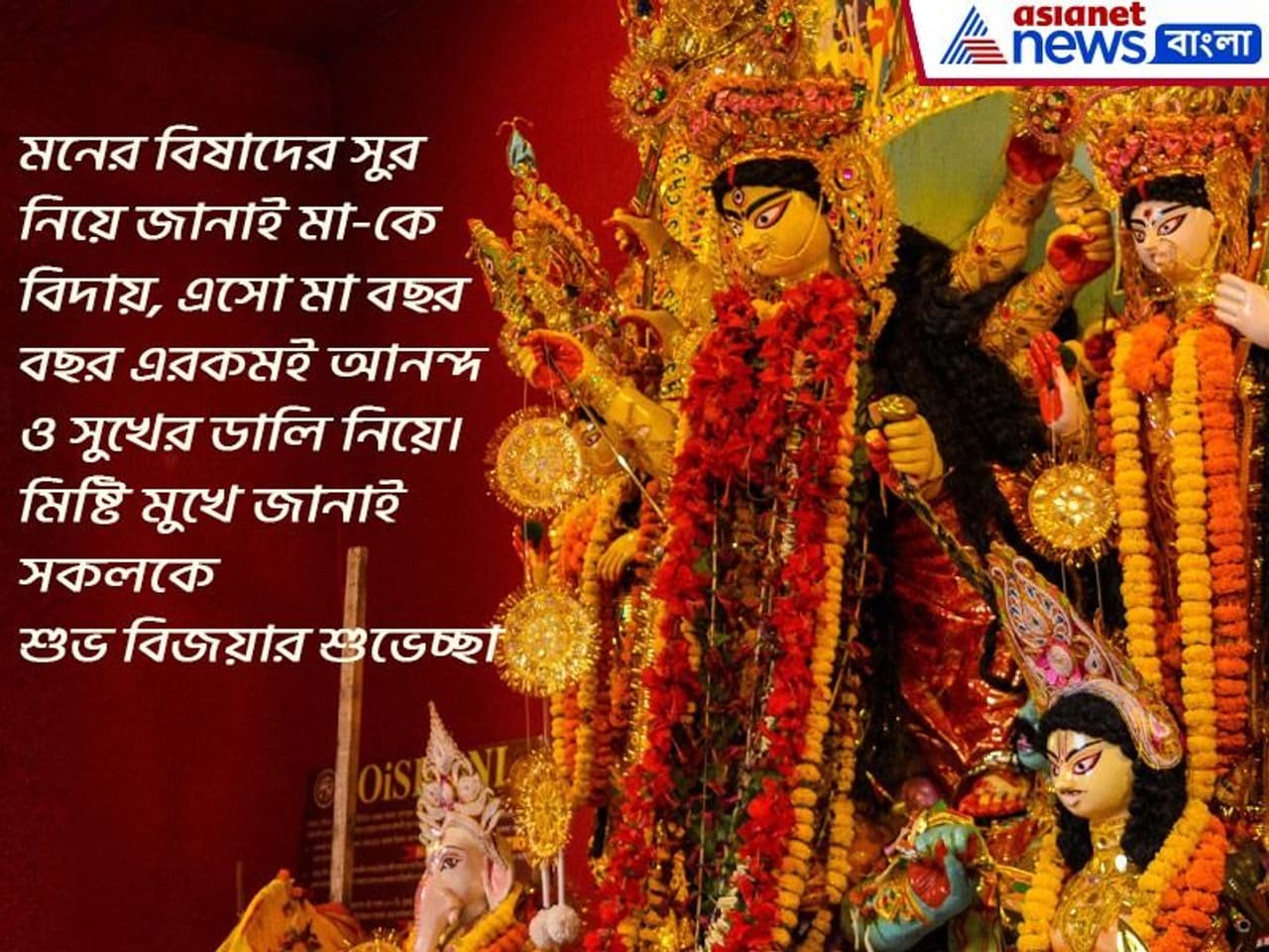 ঢাকের কাঠির বিদায় সুরে উদাস করে মন, চললেন মা মহামায়া আজকে বিসর্জন। শুভ বিজয়া।- দেবী দুর্গা যেন সকলের জীবনে সুখ বয়ে আনুক, এই প্রার্থনাই করুন। মায়ের বিদায় বেলায় সকলের জন্য সুখ কামনা করুন তার কাছে। গোটা একটা বছর যেন সকলের ভালো কাটে তাই প্রার্থনা করুন।