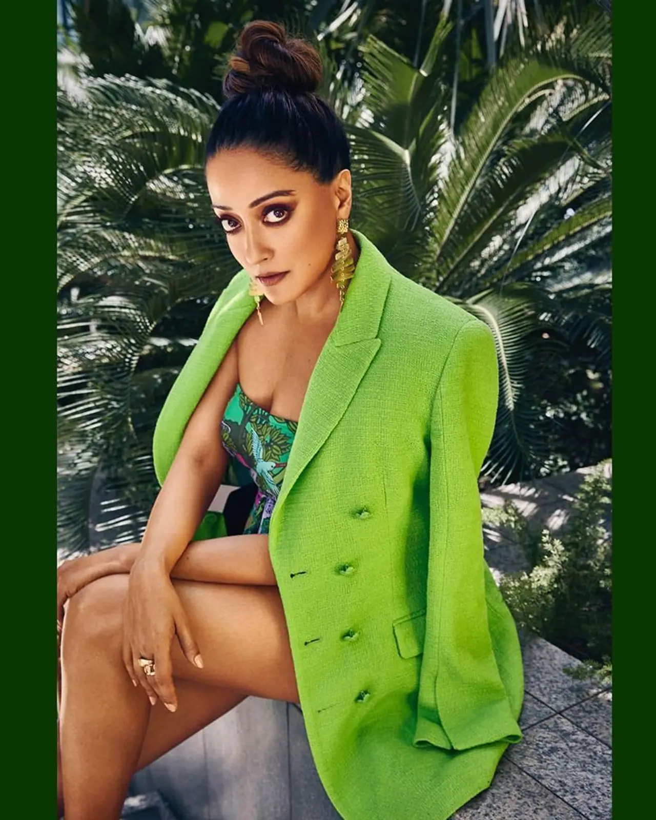 প্রিন্টেড মনোকিনির উপর সবুজ রঙের ওভারকোর্ট গায়ে চাপিয়ে ঝড় তুলেছেন রাইমা সেন। পায়ে  গাঢ় গোলাপি রঙের হাই-হিল জুতো। মাথায় বাধা নপটপ, কানে সোনালি রঙের বড় কানের দুল। কখনও বসে, কখনও দাঁড়িয়ে ছবিতে পোজ দিয়েছেন রাইমা।