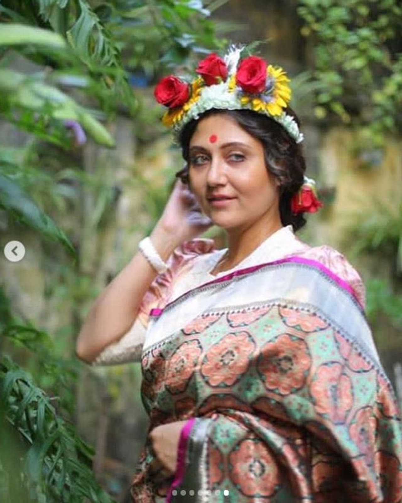 হাতে মোটা শাখা, মাথায় ফুলের সাজ-এ তিনি যেন লাস্যময়ী।