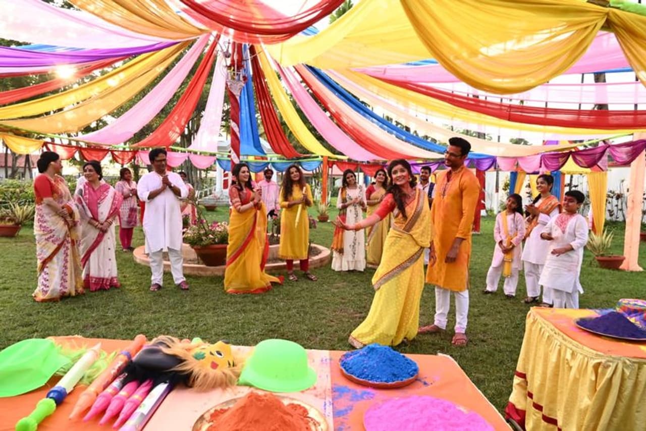 হোলির (Holi) প্রস্তুতি বেশ কিছুদিন আগেই শুরু করে দিয়েছে গাঙ্গুলি পরিবার। পারমিতা, অনু, শুভ্রা সকলে মিলে রং কিনে এনেছে। বাড়িতে তৈরি হয়েছে নানা রকম মিষ্টি। সাজানো হয়েছে বাগান। সেখানে আমন্ত্রণ জানানো হয়েছে ঘনিষ্ঠদের। নাচ, গান, খাওয়া-দাওয়া ও আনন্দের মধ্যে হোলি উদযাপনে ব্যস্ত পুরো পরিবারে।
