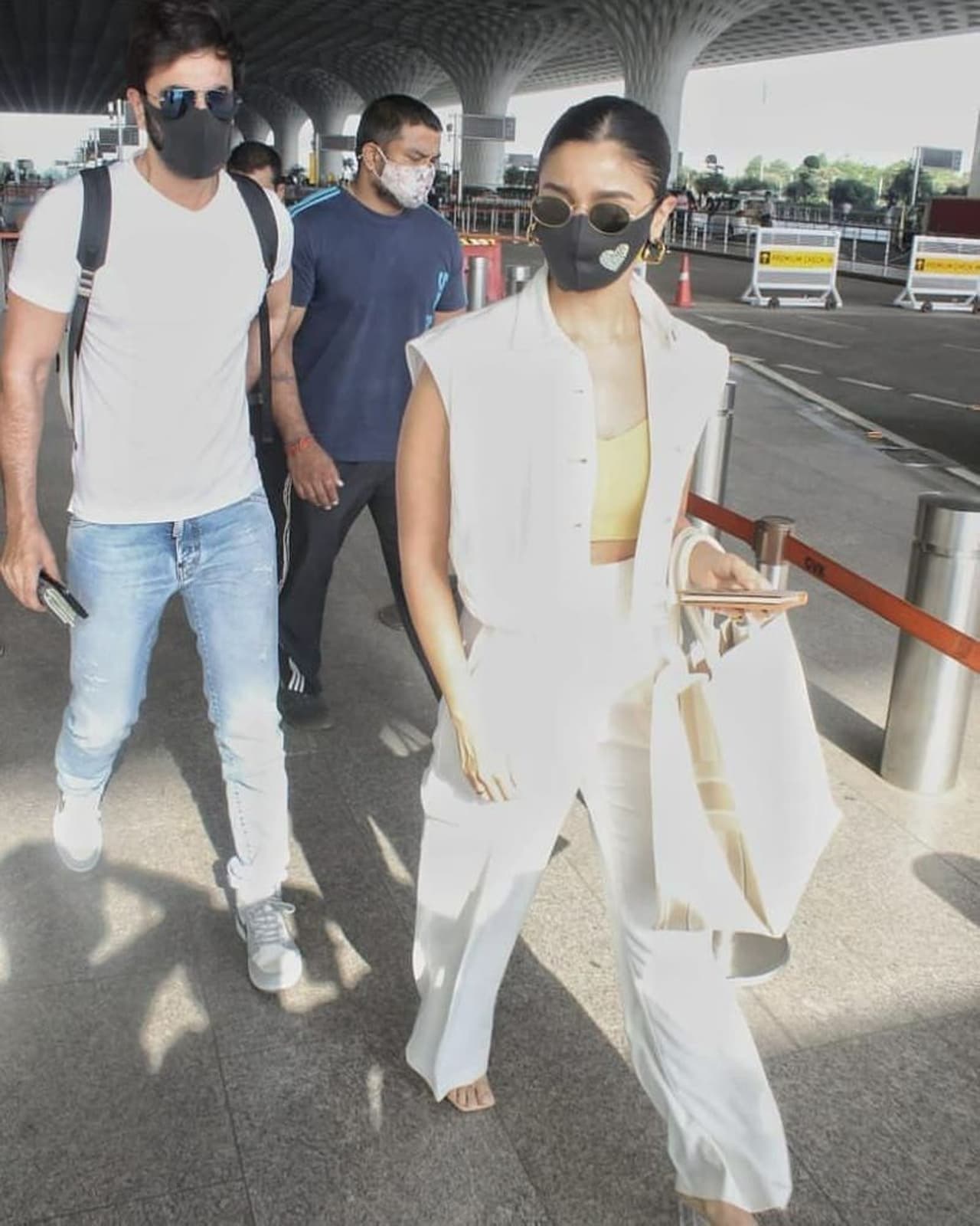 ক্যাজুয়াল স্টাইলিশ পোশাকে ধরা দিয়েছেন দুজনে। সাদা ট্রাউজার সঙ্গে হলুদ ক্রপটপ এবং ম্যাচিং সাদা জ্যাকেটে মুখ মাস্ক পরেই বিমানবন্দরে দেখা গিয়েছে আলিয়াকে। হাতের জুটের সাদা ব্যাগ নজর কেড়েছে।